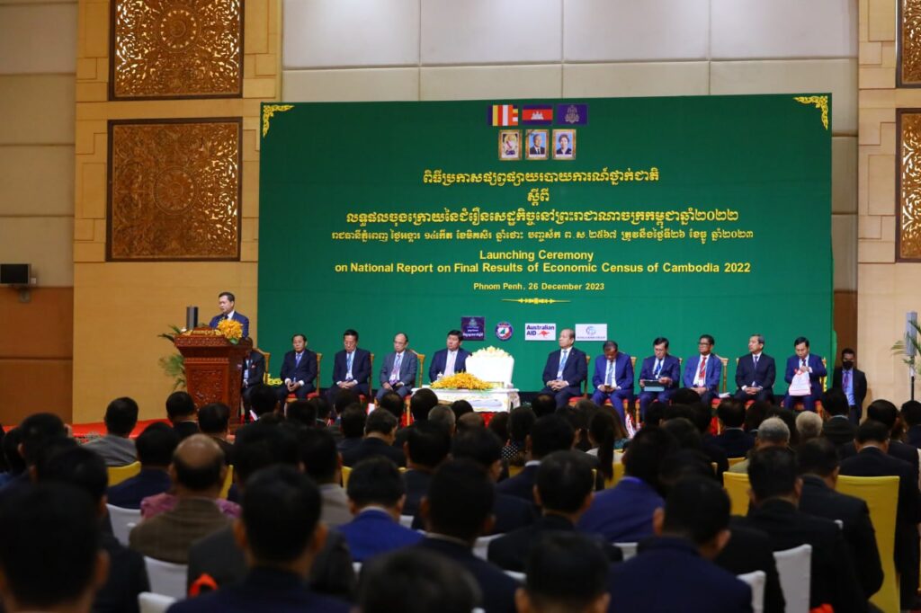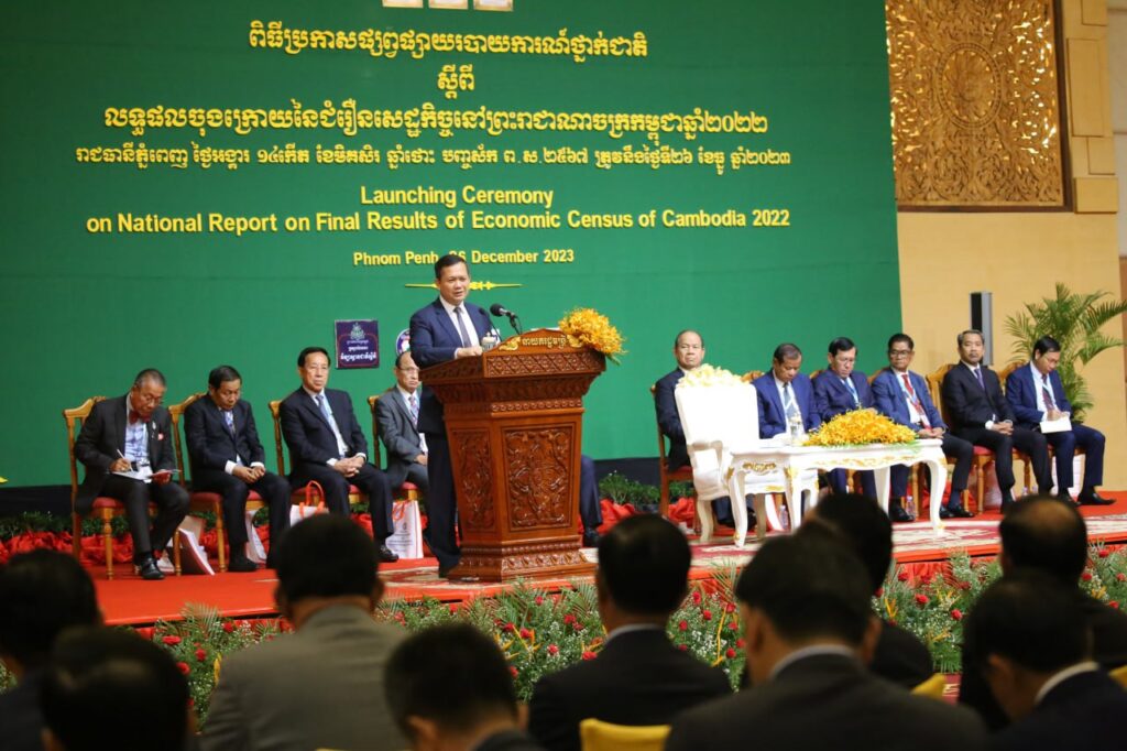 ភ្នំពេញ៖ សម្តេចធិបតី ហ៊ុន ម៉ាណែត បានណែនាំឱ្យក្រសួងផែនការ ប្រែក្លាយទិន្នន័យជំរឿនសេដ្ឋកិច្ច ឲ្យទៅជាព័ត៌មានគ្រប់ជ្រុងជ្រោយ និងច្បាស់លាស់ តាមបែបវិទ្យាសាស្ត្រ និងលើកទឹកចិត្ត ឱ្យផ្សព្វផ្សាយលទ្ធផលទាំងនេះ បានទូលំទូលាយដល់គ្រប់ ក្រសួង-ស្ថាប័នពាក់ព័ន្ធ ។ សម្តេចមហាបវរធិបតី ហ៊ុន ម៉ាណែត នាយករដ្ឋមន្ត្រី កម្ពុជា បានណែនាំបែបនេះ ក្នុងឱកាសអញ្ជើញជាអធិបតីក្នុងពិធីប្រកាសផ្សព្វផ្សាយរបាយការណ៍ថ្នាក់ជាតិ ស្តីពីលទ្ធផលចុងក្រោយ នៃជំរឿនសេដ្ឋកិច្ចនៅកម្ពុជា ឆ្នាំ២០២២ នាព្រឹកថ្ងៃទី២៦ ខែធ្នូ ឆ្នាំ២០២៣ ។