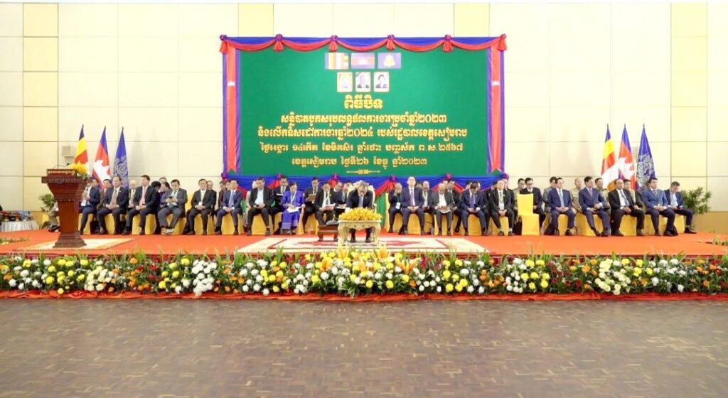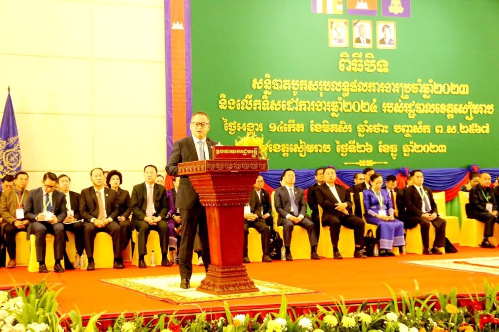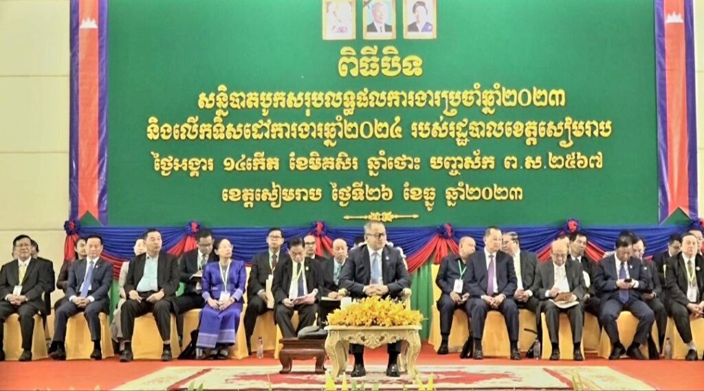 សៀមរាប៖នាយឧត្ដមសេនីយ៍ ទៀ សីហា ឧបនាយករដ្ឋមន្ដ្រីរដ្ឋមន្ដ្រី ក្រសួងការពារជាតិ កាលពីព្រឹកថ្ងៃទី២៦ ខែធ្នូ ឆ្នាំ២០២៣ បាន អញ្ជើញជាអធិបតីក្នុងបិទសន្និបាត បូក សរុបលទ្ធផលការងារឆ្នាំ ២០២៣ និងលើកទិសដៅការងារឆ្នាំ២០២៤ របស់រដ្ឋបាល ខេត្ដ សៀមរាប។ក្នុងឱកាសនេះឯកឧត្តមបានផ្តល់នូវអនុសាសន៍មួយ ចំនួន ដល់រដ្ឋបាលខេត្តសម្រាប់អនុវត្តបន្ត ។