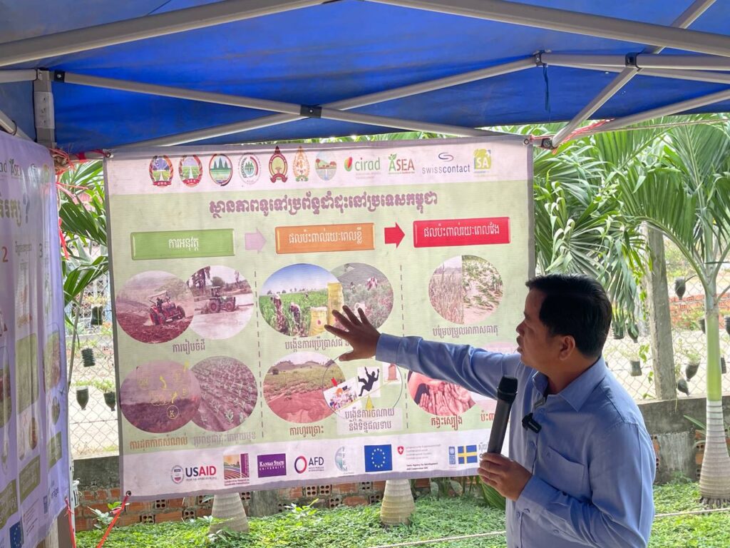 ថ្លែងបញ្ជាក់ប្រាប់ក្នុងដំណើរទស្សនកិច្ចរបស់អ្នកសារព័ត៌មាន ក្នុងយុទ្ធនាការបញ្រ្ជាបចំណេះដឹង ស្តីពី «ការឆ្លើយតបនឹងការប្រែប្រួលអាកាសធាតុរបស់កម្ពុជា”ចាប់ពីថ្ងៃទី ២២ ដល់ ២៤ ខែធ្នូ ឆ្នាំ២០២៣នាមជ្ឈមណ្ឌលសេវាកម្មកសិកម្មអភិរក្ស ស្ថិតនៅភូមិស្តៅ ឃុំស្រុកស្តៅ ស្រុករតនៈមណ្ឌល ខេត្ត បត់ដំបង លោក ស វ៉េង ទីប្រឹក្សាផ្នែកបច្ចេកទេស នៃមជ្ឈមណ្ឌលស្រាវជ្រាវ និងអភិវឌ្ឍន៍កសិកម្ម នៅកម្ពុជា បានលើកឡើងថា ៖ បច្ចេកទេសកសិកម្មអភិរក្ស ឬហៅកសិអេកូឡូស៊ី ដែលបានអនុវត្តចាប់តាំងពីឆ្នាំ ២០០៩មក ជាបច្ចេកទេសដាំដុះ ដោយធ្វើការកាត់បន្ថយការភ្ជួររាស់ និងការរគ្រប់គ្រងដីឱ្យមាននិរន្តភាព តាមរយៈការដាំដំណាំគម្របដី ។