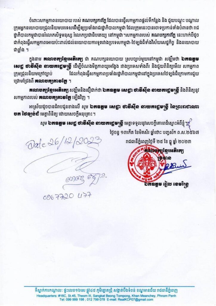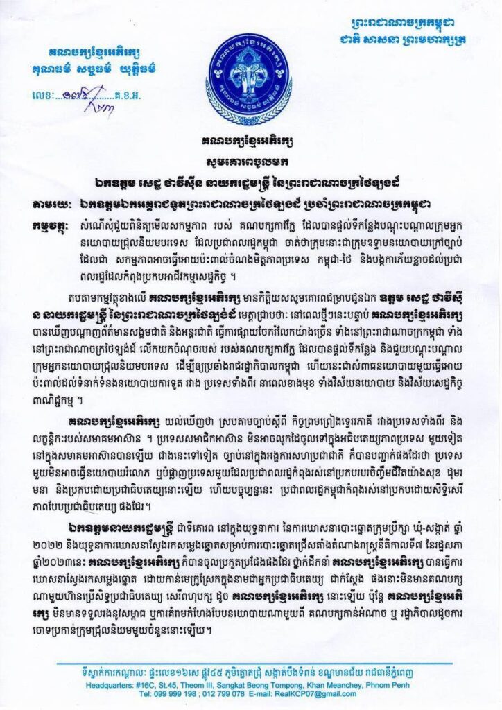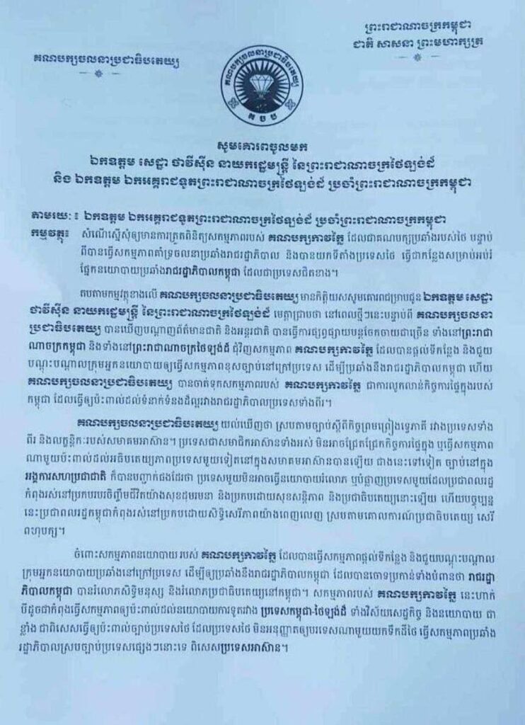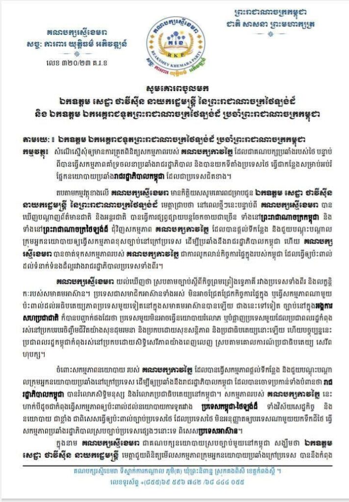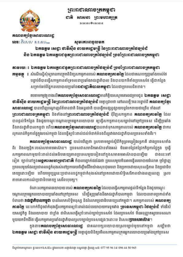 ក្នុងនាមជាគណបក្សនយោបាយស្របច្បាប់នៅកម្ពុជា សង្ឃឹមថា ឯកឧត្តម សេដ្ឋា ថាវីស៊ីន នាយករដ្ឋមន្ត្រី មេត្តាជួយពិនិត្យមើលសកម្មភាពក្រុមអ្នកនយោបាយប្រឆាំងក្រៅប្រទេស បាននិងកំពុងយកទឹកដីថៃ ធ្វើជាមូលដ្ឋានវាយប្រហារមកលើរាជរដ្ឋាភិបាលកម្ពុជា និងបានធ្វើសកម្មភាពប្រឆាំងរាជរដ្ឋាភិបាលកម្ពុជានៅក្នុងប្រទេសថៃក្រោមការជួយជ្រោមជ្រែងពីគណបក្សកាវក្លៃ។ សង្ឃឹមនឹងជឿជាក់ថា ឯកឧត្តម សេដ្ឋា ថាវីស៊ីន នាយករដ្ឋមន្ត្រី និងពិនិត្យទៅលើសកម្មភាពរបស់គណបក្សកាវក្លៃ ឡើងវិញ ដើម្បីរឹតចំណងមិត្តភាពរវាងប្រទេសទាំងពីរកាន់តែយូរអង្វែង៕