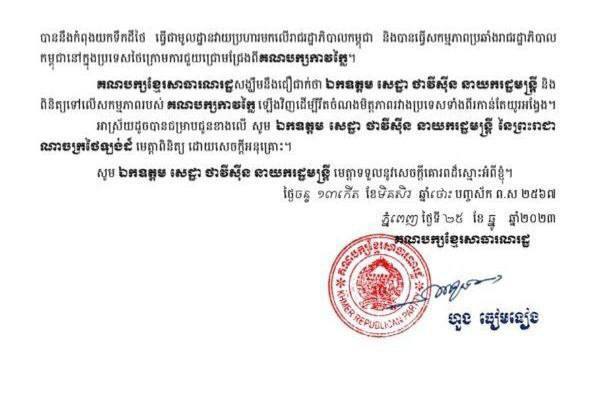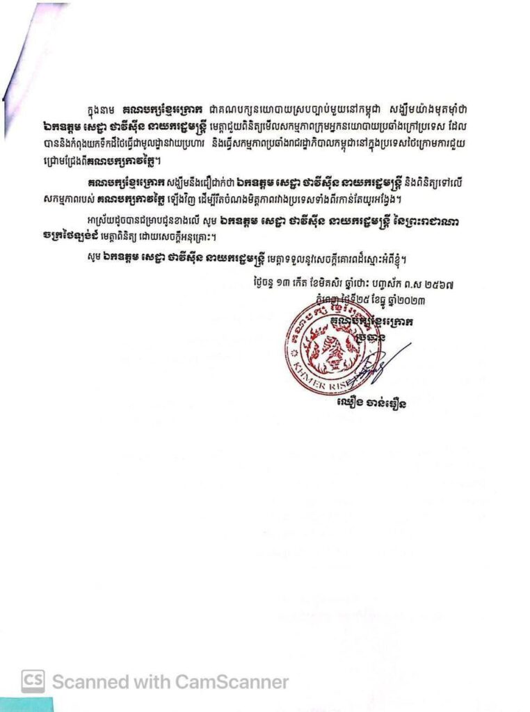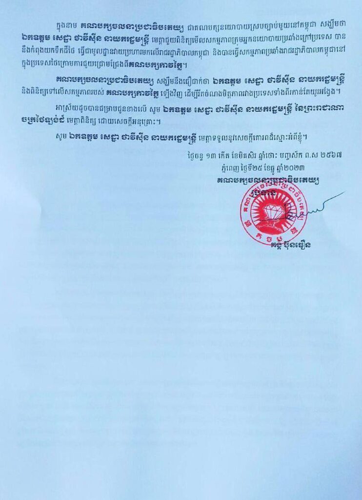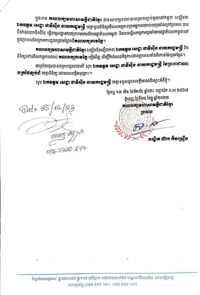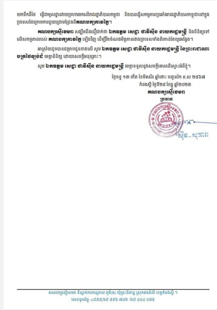 ក្នុងនាមជាគណបក្សនយោបាយស្របច្បាប់នៅកម្ពុជា សង្ឃឹមថា ឯកឧត្តម សេដ្ឋា ថាវីស៊ីន នាយករដ្ឋមន្ត្រី មេត្តាជួយពិនិត្យមើលសកម្មភាពក្រុមអ្នកនយោបាយប្រឆាំងក្រៅប្រទេស បាននិងកំពុងយកទឹកដីថៃ ធ្វើជាមូលដ្ឋានវាយប្រហារមកលើរាជរដ្ឋាភិបាលកម្ពុជា និងបានធ្វើសកម្មភាពប្រឆាំងរាជរដ្ឋាភិបាលកម្ពុជានៅក្នុងប្រទេសថៃក្រោមការជួយជ្រោមជ្រែងពីគណបក្សកាវក្លៃ។ សង្ឃឹមនឹងជឿជាក់ថា ឯកឧត្តម សេដ្ឋា ថាវីស៊ីន នាយករដ្ឋមន្ត្រី និងពិនិត្យទៅលើសកម្មភាពរបស់គណបក្សកាវក្លៃ ឡើងវិញ ដើម្បីរឹតចំណងមិត្តភាពរវាងប្រទេសទាំងពីរកាន់តែយូរអង្វែង៕