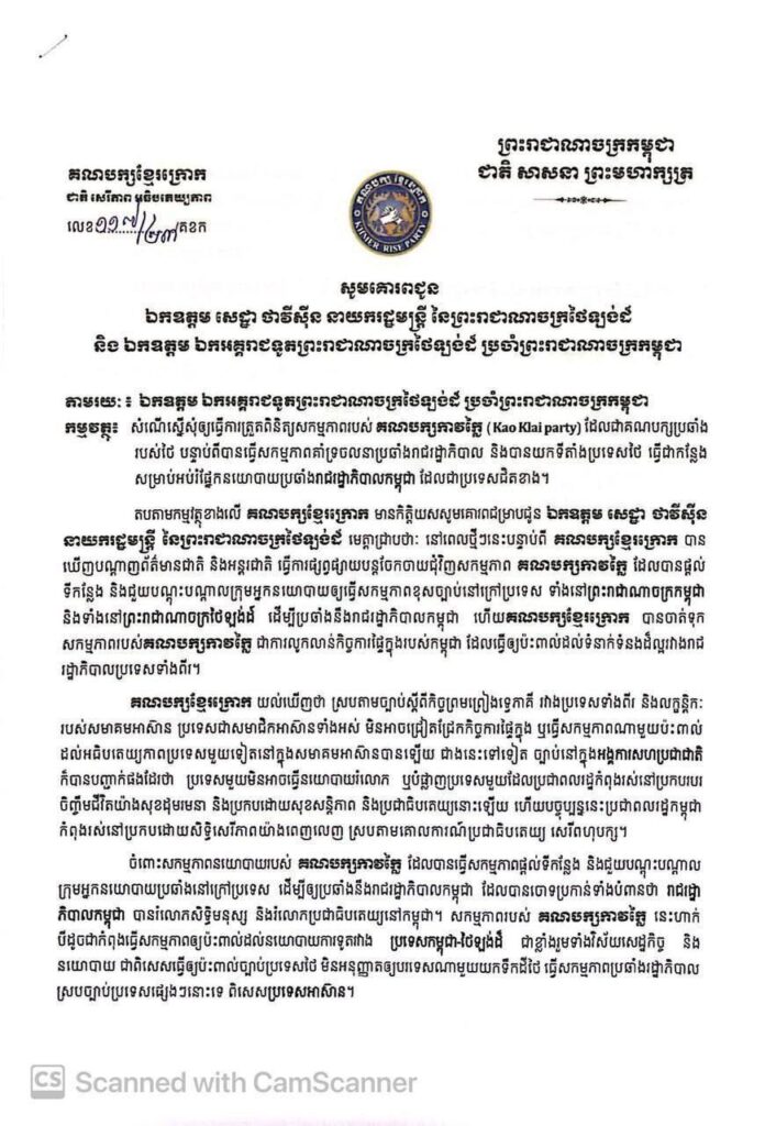 ភ្នំពេញ៖ គណបក្សនយោបាយជាច្រើននៅក្នុងប្រទេសកម្ពុជា បានធ្វើលិខិតដាក់ដោយឡែកពីគ្នាជូនឯកឧត្តម សេដ្ឋា ថាវីស៊ីន នាយករដ្ឋមន្ត្រី នៃព្រះរាជាណាចក្រថៃឡង់ដ៏ និងឯកឧត្តមឯកអគ្គរាជទូតព្រះរាជាណាចក្រថៃឡង់ដ៍ ប្រចាំព្រះរាជាណាចក្រកម្ពុជា កាលពីថ្ងៃទី២៥ ខែធ្នូ ឆ្នាំ២០២៣ ស្នើសុំឱ្យមានការត្រួតពិនិត្យសកម្មភាពរបស់គណបក្សកាវក្លៃ ដែលជាគណបក្សប្រឆាំងរបស់ថៃ បន្ទាប់ពីបានធ្វើសកម្មភាពគាំទ្រចលនាប្រឆាំងរាជរដ្ឋាភិបាល និងបានយកទីតាំងប្រទេសថៃ ធ្វើជាកន្លែងសម្រាប់អប់រំ ផ្នែកនយោបាយប្រឆាំងរាជរដ្ឋាភិបាលកម្ពុជា ដែលជាប្រទេសជិតខាង។