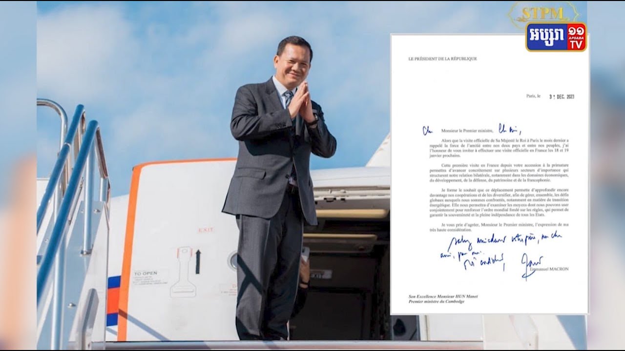 ប្រធានាធិបតីបារាំង លោក អេម៉ានូអែល ម៉ាក្រុង បានថ្លែងក្នុងសារលិខិតមួយមកកាន់សម្តេចធិបតីនាយករដ្ឋមន្ត្រី នៃប្រទេសកម្ពុជា ជាមួយការអញ្ជើញទៅបំពេញទស្សនកិច្ច និងចាត់ទុកថា លោកចង់ឱ្យដំណើរទស្សនកិច្ចនោះ បើកលទ្ធភាពធ្វើឱ្យកិច្ចសហប្រតិបត្តិការរវាងប្រទេសបារាំង និងកម្ពុជា កាន់តែស៊ីជម្រៅ និងកាន់តែមានលក្ខណៈសម្បូរបែប ដើម្បីរួមគ្នាដោះស្រាយបញ្ហាសកល ដែលពិភពលោកកំពុងប្រឈមមុខជាអាទិ៍ ក្នុងវិស័យអន្តរកាលថាមពល។ សម្តេចធិបតី ហ៊ុន ម៉ាណែត និងបណ្ឌិត ពេជ ចន្ទមុន្នី ហ៊ុនម៉ាណែត គ្រោងនឹងបំពេញទស្សនកិច្ច ក្នុងប្រទេសបារាំង នាពាក់កណ្តាលខែមករានេះ ដែលជាការឆ្លើយតបចំពោះការអញ្ជើញ របស់ប្រធានាធិបតីបារាំង និងដើម្បីចូលរួមក្នុងកិច្ចប្រជុំកំពូលប្រចាំឆ្នាំ របស់វេទិកាសេដ្ឋកិច្ចពិភពលោក (WEF) ឆ្នាំ២០២៤ នៅប្រទេសស្វីសផងដែរ។ អប្សរាណិតរាយការណ៍