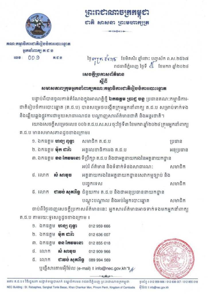 (ភ្នំពេញ)៖នៅថ្ងៃទី ៥ ខែ មករា ឆ្នាំ ២០២៤នេះគណៈកម្មាធិការ ជាតិរៀបចំការបោះឆ្នោត (គជ.ប)បានបង្ហាញពីសមាសភាពក្រុមអ្នកនាំពាក្យ គណៈកម្មាធិការជាតិរៀបចំការបោះឆ្នោតដែលមានសមាសភាពចំនួន៥រូប។