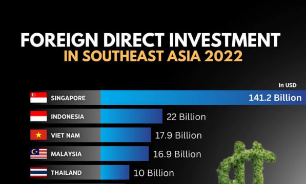 សិង្ហបុរីគឺជាប្រទេសដែលទទួលបាន FDI ច្រើនសន្ធឹកសន្ធាប់ក្នុងឆ្នាំ ២០២២ ជាមួយនឹងទំហំវិនិយោគដល់ទៅជាង ១៤១ ពាន់លានដុល្លារ។ ស្ថិតក្នុងលំដាប់ទី២ គឺឥណ្ឌូណេស៊ីដែលមានទំហំវិនិយោគជាង ២២ ពាន់លានដុល្លារ។ វៀតណាមជាប់លេខ៣ ដោយមានទំហំវិនិយោគផ្ទាល់ពីបរទេស១៧,៩ពាន់លានដុល្លារ – UNCTAD via Seasia