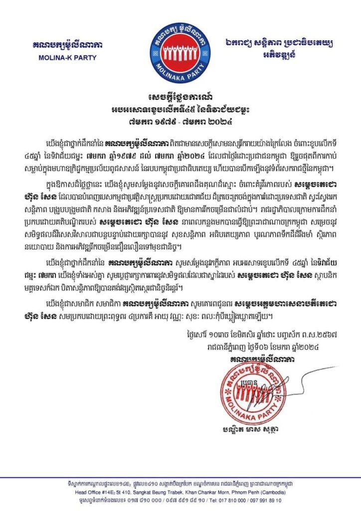 ជាមួយគ្នានេះ ថ្នាក់ដឹកនាំនៃគណបក្សម៉ូលីណាកា សូមសម្តែងនូវភក្តីភាព អបអរសាទរខួបលើកទី៤៥ឆ្នាំ នៃទិវាជ័យជម្នះ ៧មករា និងសូមប្តេជ្ញារក្សាការពារនូវសមិទ្ធផលដែលជាស្នាដៃរបស់សម្តេចតេជោ ហ៊ុន សែន ស្ថាបនិកមគ្គទេសក៍ឯក បិតាសន្តិភាពឱ្យបានគង់វង្សស្ថិតស្ថេរជានិច្ចនិរន្តរ៍៕