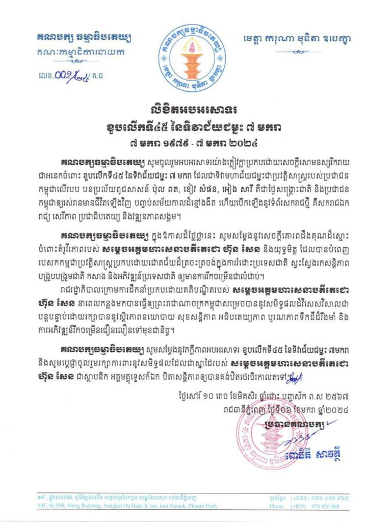 គណបក្សធម្មាធិបតេយ្យអបអរសាទរខួបលើកទី៤៥ នៃទិវាជ័យជម្នះ ៧ មករា ជាប្រវត្តិសាស្ត្ររបស់ប្រជាជនកម្ពុជាលើរបបបនប្រល័យពូជសាសន៍