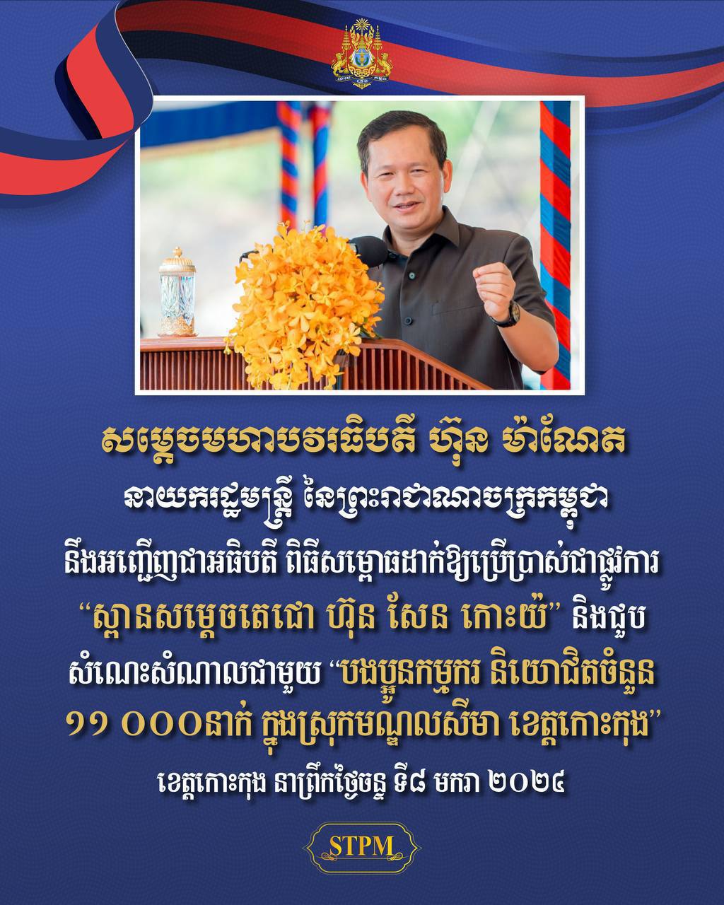 កោះកុង៖ នៅព្រឹកថ្ងៃចន្ទ ១២រោច ខែមិគសិរ ឆ្នាំថោះ បញ្ចស័ក ពុទ្ធសករាជ ២៥៦៧ ត្រូវនឹងថ្ងៃទី៨ មករា ២០២៤ សម្តេចមហាបវរធិបតី ហ៊ុន ម៉ាណែត នាយករដ្ឋមន្ត្រី នៃព្រះរាជាណាចក្រកម្ពុជា នឹងអញ្ជើញជាអធិបតី ពិធីសម្ពោធដាក់ឱ្យប្រើប្រាស់ជាផ្លូវការ “ស្ពានសម្តេចតេជោ ហ៊ុន សែន កោះយ៉” និងជួបសំណេះសំណាលជាមួយ “បងប្អូនកម្មករ និយោជិតចំនួន ១១ ០០០នាក់ ក្នុងស្រុកមណ្ឌលសីមា ខេត្តកោះកុង” ។