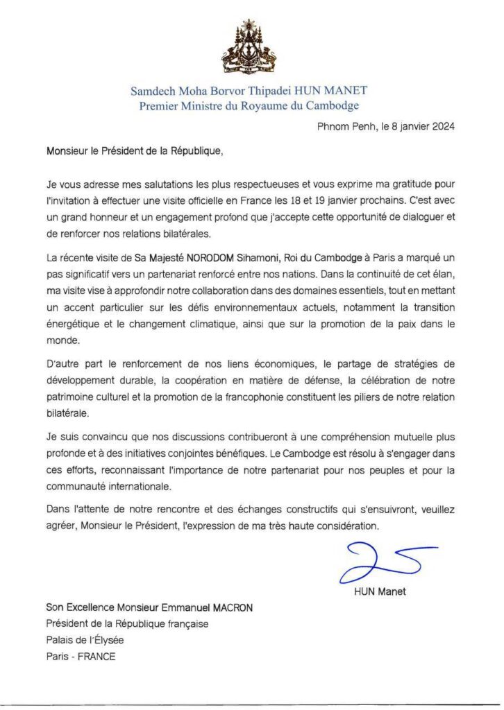 ភ្នំពេញ៖ សម្តេចមហាបវរធិបតី ហ៊ុន ម៉ាណែត នាយករដ្ឋមន្ត្រី នៃព្រះរាជាណាចក្រកម្ពុជា នៅថ្ងៃទី៨ ខែមករា ឆ្នាំ២០២៤នេះ បានធ្វើលិខិតជូនឯកឧត្តម អេម៉ានុយអែល ម៉ាក្រុង ប្រធានាធិបតីសាធារណរដ្ឋបារាំង តបតាមលិខិតអញ្ជើញរបស់ឯកឧត្តមប្រធានាធិបតី អញ្ជើញសម្តេចទៅបំពេញទស្សនកិច្ចផ្លូវការនៅសាធារណរដ្ឋបារាំង នៅថ្ងៃទី១៨-១៩ ខែមករា ខាងមុខនេះ។