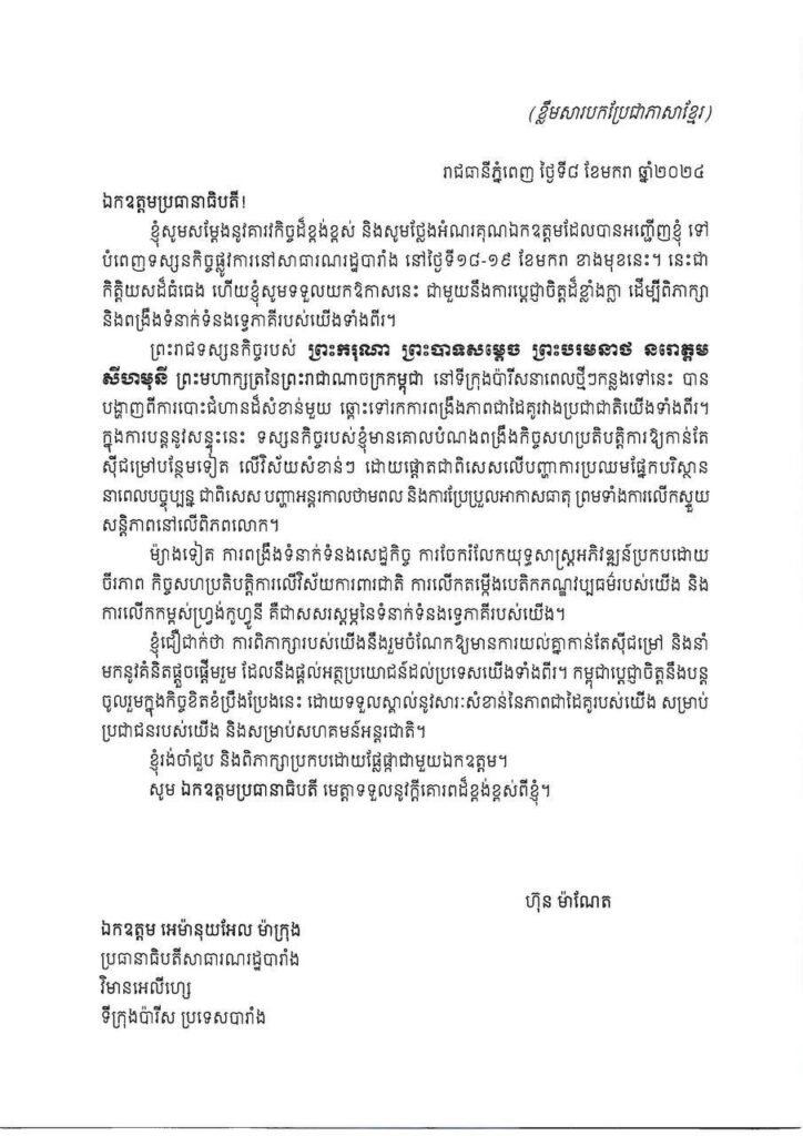 សម្តេចធិបតី ហ៊ុន ម៉ាណែត ផ្ញើលិខិតជូនប្រធានាធិបតីសាធារណរដ្ឋបារាំង អំពីការអញ្ជើញសម្តេចទៅបំពេញទស្សនកិច្ចផ្លូវការនៅបារាំង នាថ្ងៃទី១៨-១៩ ខែមករា