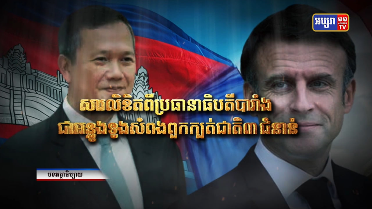 ប្រធានាធិបតីបារាំងលោក អេម៉ានូអែល ម៉ាក្រុង បានធ្វើសារលិខិតមួយអញ្ជើញសម្តេចមហាបវរធិបតី ហ៊ុន ម៉ាណែត និងលោកជំទាវ ដើម្បីបំពេញទស្សនកិច្ចជាផ្លូវការ ក្នុងសាធារណរដ្ឋបារាំង។ សារលិខិតរបស់លោក អេម៉ានូអែល ម៉ាក្រុង គឺជាសារមួយដែលបង្កប់អត្ថន័យដ៏ជ្រាលជ្រៅ និងជាអន្លូងទូងចំពោះទណ្ឌិតក្បត់ជាតិបីជំនាន់ សម រង្ស៊ី ដែលព្យាយាមចង់ប្រមែប្រមូលគ្នីគ្នាធ្វើបាតុកម្ម ប្រឆាំងនឹងដំណើរទស្សនកិច្ច ប្រមុខដឹកនាំរាជរដ្ឋាភិបាលកម្ពុជា។ អប្សរាណិតមានបទអត្ថាធិប្បាយមួយ ក្រោមចំណងជើងថា «សារលិខិតពីប្រធានាធិបតីបារាំង ជាអន្លូងទូងសំពងពួកក្បត់ជាតិ៣ជំនាន់»