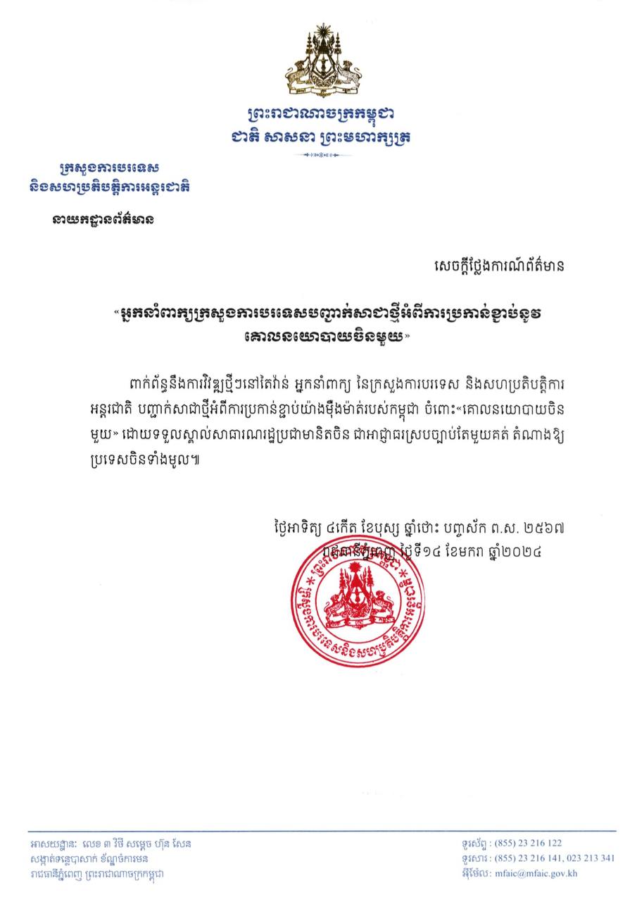 (ភ្នំពេញ)៖ ពាក់ព័ន្ធនឹងការវិវឌ្ឍថ្មីៗនៅតៃវ៉ាន់ អ្នកនាំពាក្យ នៃក្រសួងការបរទេស និង សហប្រតិបត្តិការអន្តរជាតិកម្ពុជា បញ្ជាក់សាជាថ្មី អំពីការប្រកាន់ខ្ជាប់ យ៉ាងម៉ឺង ម៉ាត់ របស់កម្ពុជា ចំពោះ «គោលនយោបាយចិនមួយ» ដោយទទួលស្គាល់សាធា រណរដ្ឋ ប្រជាមានិតចិន ជាអាជ្ញាធរស្របច្បាប់តែមួយគត់ តំណាងឱ្យប្រទេស ចិន ទាំងមូល ។