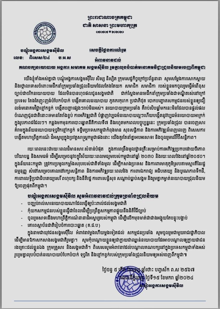 ភ្នំពេញ៖ បណ្ដុំអង្គការសង្គមស៊ីវិល អំពាវនាវដល់គណបក្សនយោបាយ អង្គការ សមាគម សង្គមស៊ីវិល នៅក្នុងប្រទេសកម្ពុជាទាំងអស់ រួបរួមគ្នាលុបបំបាត់នយោបាយបំបែកបំបាក់ ទុច្ចរិត និងខ្មៅកខ្វក់របស់ក្រុមប្រឆាំងជ្រុលនិយមឱ្យអស់ចេញពីកម្ពុជា។ ចូលរួមជាមួយរាជរដ្ឋាភិបាល ដើម្បីមានឱកាសកសាងសង្គមជាតិរួមគ្នា។ សូមកុំបណ្តោយខ្លួនឱ្យជាក្លាយជាឈ្នាន់នយោបាយដែរអាចបណ្ដាលឱ្យក្លាយជាជនរងគ្រោះដល់ខ្លួនឯង ក្រុមគ្រួសារ និងសង្គមជាតិ។ នេះបើយោងតាមសេចក្តីថ្លែងការណ៍រួមរបស់បណ្ដុំអង្គការសង្គមស៊ីវិល នៅថ្ងៃទី១៤ ខែមករា ឆ្នាំ២០២៤។