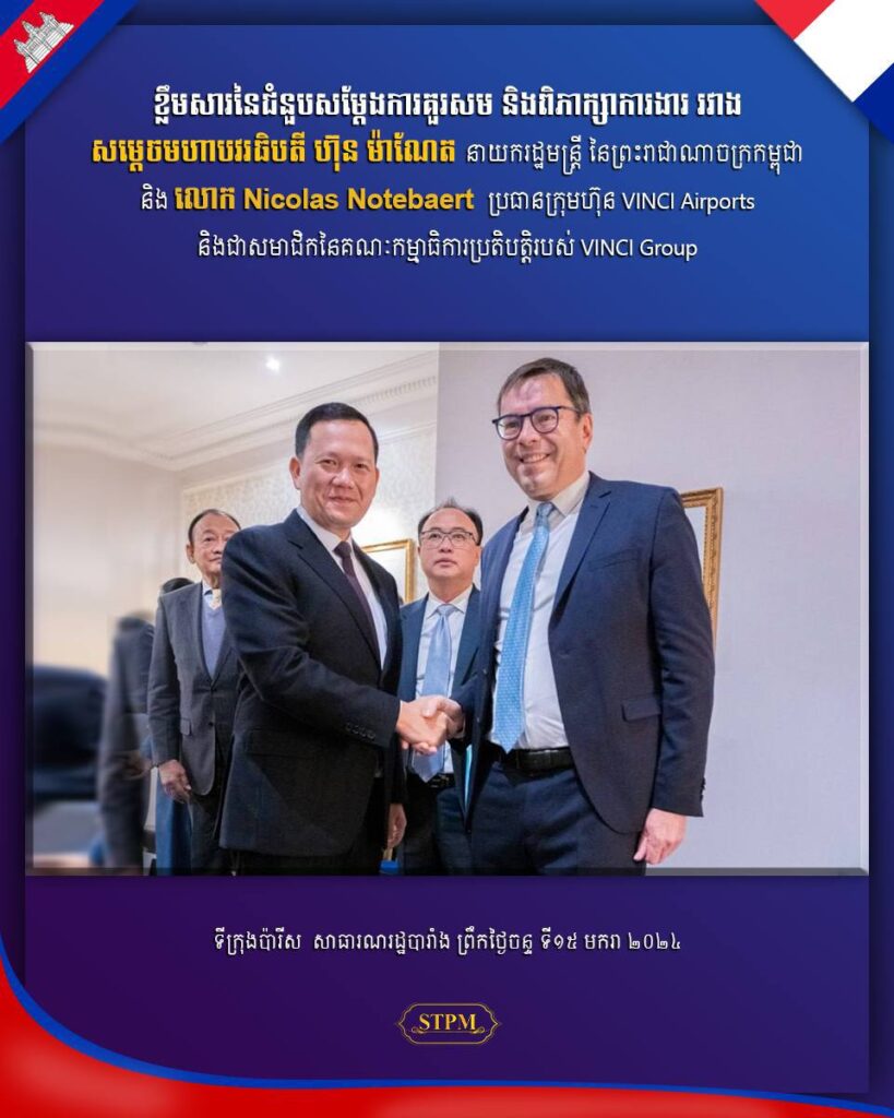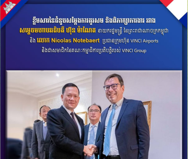 អគ្គនាយកក្រុមហ៊ុន VINCI លោក Nicolas Notebaert៖ “សុខសន្ដិភាព និងស្ថិរភាពនយោបាយនៅកម្ពុជាដែលជាលក្ខខណ្ឌអំណោយ ផល ដ៏សំខាន់ដល់ការវិនិយោគរបស់ក្រុមហ៊ុននៅកម្ពុជា ព្រមទាំងបានថ្លែងអំណរគុណចំពោះរាជរដ្ឋាភិបាលកម្ពុជា ដែលបានបង្កលក្ខណៈគ្រប់បែបយ៉ាងចំពោះដំណើរការអាជីវកម្មរបស់ក្រុមហ៊ុនឱ្យដំណើរការដោយរលូននៅកម្ពុជា”។