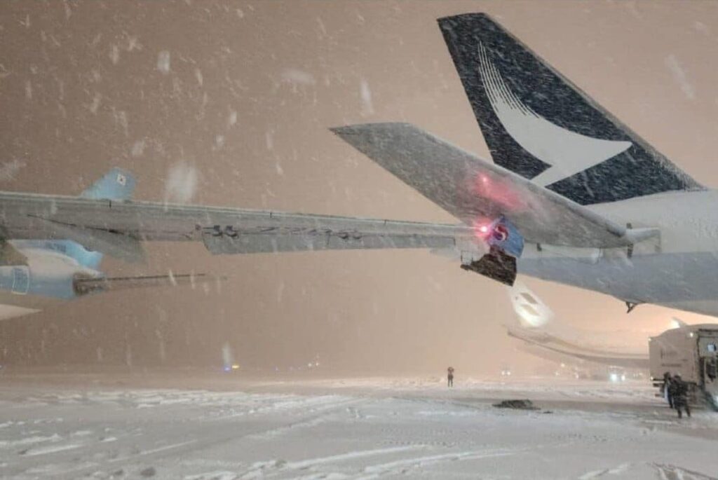 ចំណែកជើងហោះហើរចំនួន ៤៦ ត្រូវគេរាយការណ៍ថា បានលុបចោលការហោះហើរជាបណ្តោះអាសន្ន ដោយសារព្រិលធ្លាក់ខ្លាំង។