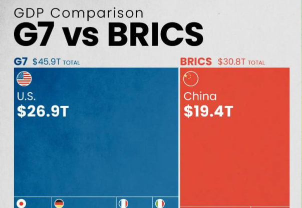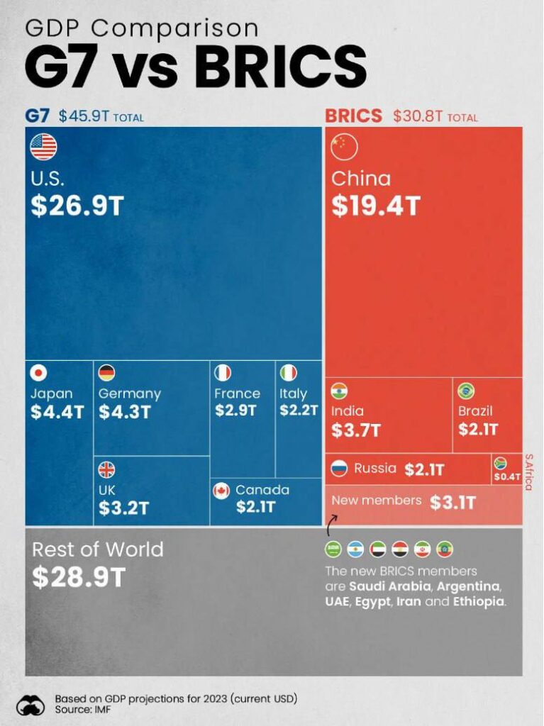 ដោយឡែក ក្រុមប្រទេសមានសេដ្ឋកិច្ចជឿនលឿន G7 ក្ដោបបានប្រមាណ ៤៣% នៃ GDP ពិភពលោក ឬជាង ៤៥,៩ទ្រីលានដុល្លារ។ ក្នុងចំណោមក្រុមប្រទេស G7 អាមេរិកមាន GDPខ្ពស់ជាងគេ គឺដល់ ២៦,៩ទ្រីលាន ខណៈលើឈរលើកំពូលតារាង BRICS គឺចិន ដែលមាន GDP ជាង ១៩,៤ទ្រីលានដុល្លារ – IMF via Visual Capitalist