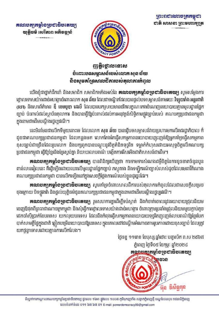 ថ្នាក់ដឹកនាំ និងសមាជិក សមាជិកាទាំងអស់នៃ គណបក្សកម្លាំងប្រជាធិបតេយ្យ ថ្កោលទោសយ៉ាងដាច់អហង្ការចំពោះលោក សុន ឆ័យ ដែលជាទណ្ឌិតដែលបានផ្តល់បទសម្ភាសន៍តាមរយៈវិទ្យុបារាំងអន្តរជាតិ (RFI) និងសារព័ត៌មាន ឌឹ ខេមបូឌា ដេលី ដែលបានបកស្រាយមានចរិតលក្ខណៈកេងចំណេញនយោបាយ គ្មានមូលដ្ឋានផ្នែកច្បាប់ ប៉ះពាល់ដល់ស្ថាប័នតុលាការ និងបានធ្វើឱ្យប៉ះពាល់ដល់ការអនុវត្តន៍សិទ្ធិតាមផ្លូវច្បាប់របស់គណបក្សប្រជាជនកម្ពុជា ក្នុងនាមជាដើមបណ្តឹងរដ្ឋប្បវេណី។