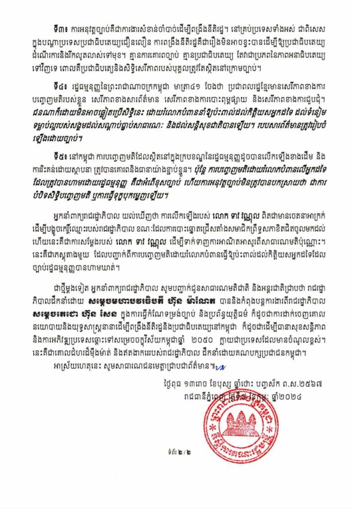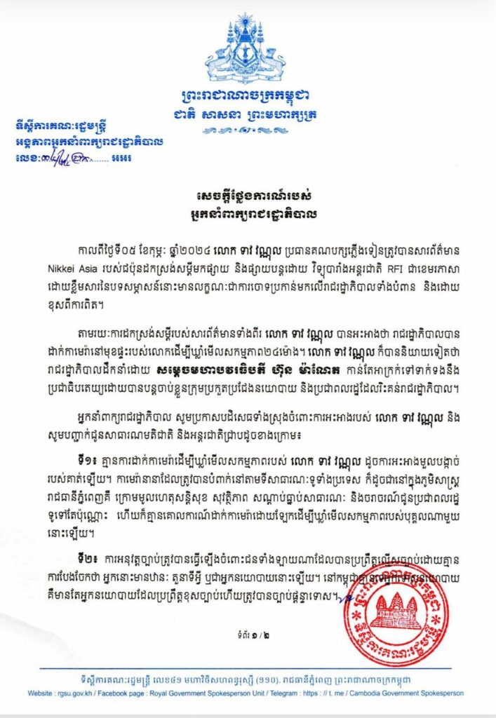 អ្នកនាំពាក្យរាជរដ្ឋាភិបាល សូមប្រកាសបដិសេធទាំងស្រុងចំពោះការអះអាងរបស់ លោក ទាវ វណ្ណុល និងសូមបញ្ជាក់ជូនសាធារណមតិជាតិ និងអន្តរជាតិជ្រាបដូចខាងក្រោម៖