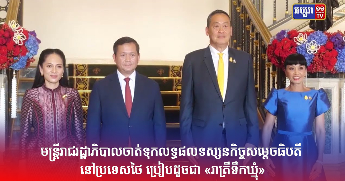 មន្ត្រីរាជរដ្ឋាភិបាលបានថ្លែងថា ដំណើរទស្សនកិច្ចមួយថ្ងៃរបស់សម្តេចធិបតី ហ៊ុន ម៉ាណែត នៅក្នុងប្រទេសថៃ បានទទួលជោគជ័យយ៉ាងក្រៃលែង។ រដ្ឋមន្ត្រីប្រតិភូអមនាយករដ្ឋមន្ត្រី លោក ហ្សង់ហ្វ្រង់ស្វ័រ តាន់ បានថ្លែងចាត់ទុកលទ្ធផលពិភាក្សា និងការចរចា រវាងនាយករដ្ឋមន្ត្រី នៃប្រទេសទាំង២ ប្រៀបដូចជា «រាត្រីទឹកឃ្មុំ»។ អប្សរាណិតរាយការណ៍