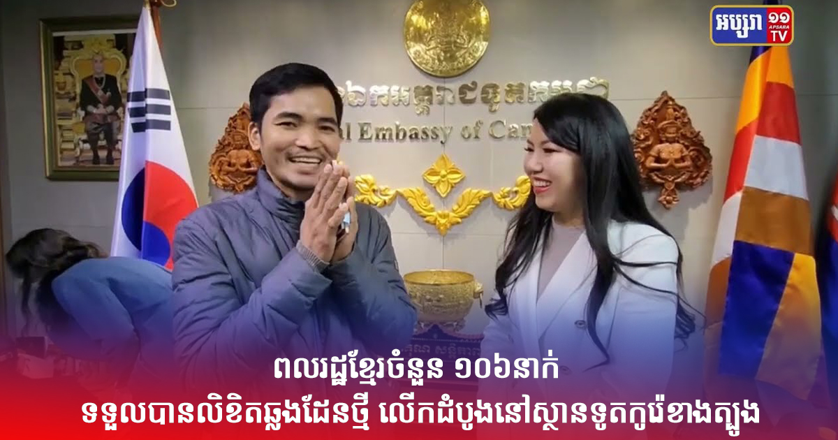 ពលរដ្ឋខ្មែរចំនួន ១០៦នាក់ ក្នុងសាធារណរដ្ឋកូរ៉េខាងត្បូង បានទទួលលិខិតឆ្លងដែនថ្មី របស់ខ្លួនជាលើកដំបូង តាមរយៈស្ថានទូតកម្ពុជា បន្ទាប់ពីមានការយកចិត្តទុកដាក់ ជួយសម្រួលរបស់ប្រមុខរាជរដ្ឋាភិបាល។