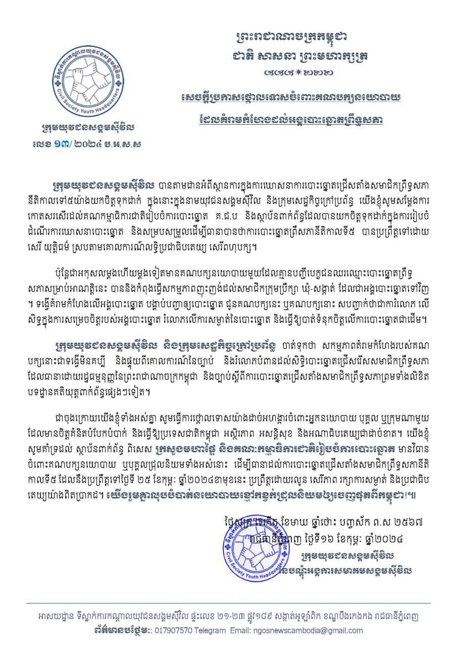 ភ្នំពេញ៖ ក្រុមយុវជនសង្គមស៊ីវិល បានតាមដានអំពីស្ថានការក្នុងការឃោសនាការបោះឆ្នោតជ្រើសតាំងសមាជិកព្រឹទ្ធសភា នីតិកាលទី៥ យ៉ាងយកចិត្តទុកដាក់ ក្នុងនោះក្នុងនាមយុវជនសង្គមស៊ីវិល និងក្រុមសេដ្ឋកិច្ចក្រៅប្រព័ន្ធ យើងខ្ញុំសូមសម្តែងការកោតសរសើរដល់គណកម្មាធិការជាតិរៀបចំការបោះឆ្នោត គ.ជ.ប និងស្ថាប័នពាក់ព័ន្ធដែលបានយកចិត្តទុកដាក់ក្នុងការរៀបចំដំណើរការឃោសនាបោះឆ្នោត និងសម្របសម្រួលដើម្បីធានាបានថាការបោះឆ្នោតព្រឹទ្ធសភា នីតិកាលទី៥ បានប្រព្រឹត្តទៅដោយសេរី យុត្តិធម៌ ស្របតាមគោលការណ៍លទ្ធិប្រជាធិបតេយ្យ សេរីពហុបក្ស។