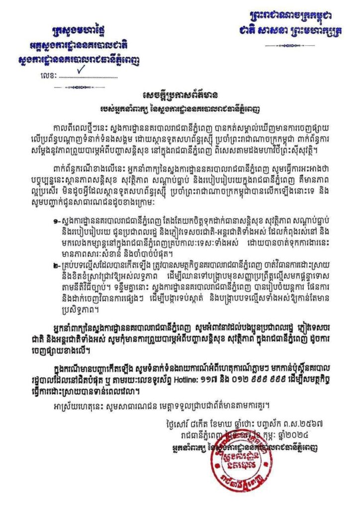 អ្នកនាំពាក្យនៃស្នងការដ្ឋាននគរបាលរាជធានីភ្នំពេញ បានអំពាវនាវដល់បងប្អូនប្រជាពលរដ្ឋ ភ្ញៀវទេសចរ ជាតិ និងអន្តរជាតិទាំងអស់ សូមកុំមានការព្រួយបារម្ភអំពីបញ្ហាសន្តិសុខ សុវត្ថិភាព ក្នុងរាជធានីភ្នំពេញ ដូចការចេញផ្សាយខាងលើ។ ក្នុងករណីមានបញ្ហាកើតឡើង សូមទំនាក់ទំនងរាយការណ៍អំពីហេតុការណ៍ភ្លាមៗ មកកាន់ប៉ុស្តិ៍នគរបាល រដ្ឋបាលដែលនៅជិតបំផុត ឬ តាមរយៈលេខទូរស័ព្ទ Hotline: ១១៧ និង ០១២ ៩៩៩ ៩៩៩ ដើម្បីសមត្ថកិច្ច ធ្វើការដោះស្រាយបានទាន់ពេលវេលា៕