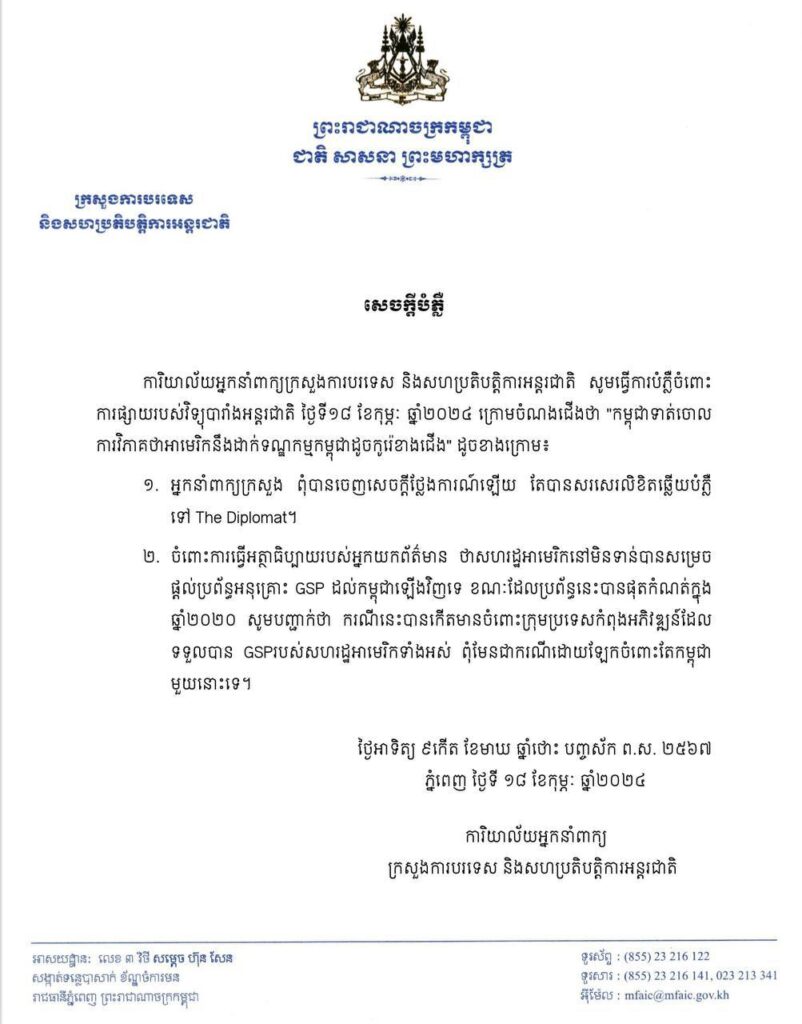 ២.ចំពោះការធ្វើអត្ថាធិប្បាយរបស់អ្នកយកព័ត៌មានថា សហរដ្ឋអាមេរិកនៅមិនទាន់បានសម្រេច ផ្តល់ប្រព័ន្ធអនុគ្រោះ GSP ដល់កម្ពុជាឡើងវិញទេ ខណៈដែលប្រព័ន្ធនេះបានផុតកំណត់ក្នុង ឆ្នាំ២០២០ សូមបញ្ជាក់ថា ករណីនេះបានកើតមានចំពោះក្រុមប្រទេសកំពុងអភិវឌ្ឍន៍ដែល ទទួលបាន GSPរបស់សហរដ្ឋអាមេរិកទាំងអស់ ពុំមែនជាករណីដោយឡែកចំពោះតែកម្ពុជាមួយនោះទេ៕