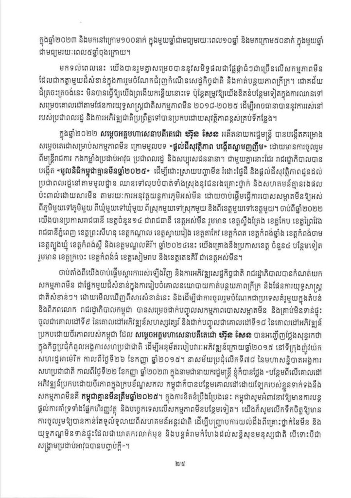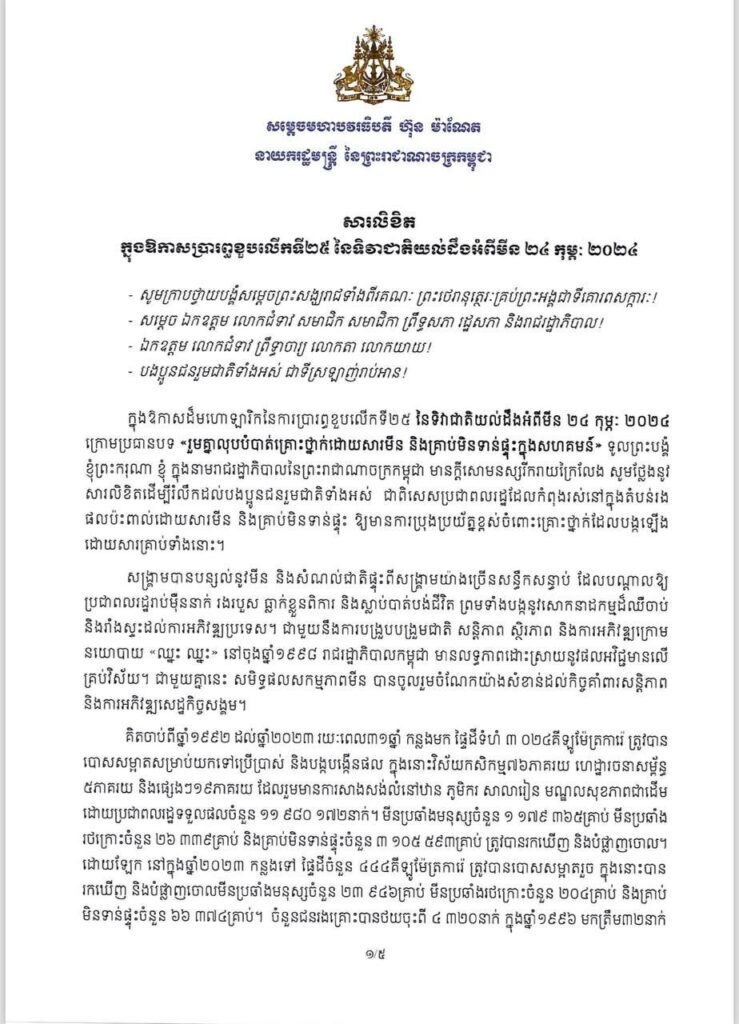 ភ្នំពេញ៖ តាមរយៈសារលិខិតក្នុងឱកាសប្រារព្ធខួប លើកទី២៥ នៃទិវាជាតិយល់ដឹងអំពីមីន ២៤ កុម្ភៈ ២០២៤ ក្រោមប្រធានបទ «រួមគ្នាលុបបំបាត់គ្រោះថ្នាក់ដោយសារមីន និងគ្រាប់មិនទាន់ផ្ទុះក្នុងសហគមន៍» សម្ដេចមហាបវរធិបតី ហ៊ុន ម៉ាណែត នាយករដ្ឋមន្ត្រី នៃព្រះរាជាណាចក្រកម្ពុជា បានលើកឡើងថា រាជរដ្ឋាភិបាលកម្ពុជា បានប្តេជ្ញាយកចិត្តទុកដាក់ដោះស្រាយបញ្ហាដែលបង្កឡើងដោយសារមីន គ្រាប់បែកចង្កោម និងសំណល់ជាតិផ្ទុះពីសង្គ្រាម ដោយអនុវត្តឱ្យបានត្រឹមត្រូវតាមគោលដៅអភិវឌ្ឍន៍ប្រកបដោយចីរភាពកម្ពុជា ២០១៦-២០៣០ ផែនការយុទ្ធសាស្ត្រជាតិសកម្មភាពមីន ២០១៨-២០២៥ និងយុទ្ធសាស្ត្រ បញ្ចកោណ ដំណាក់កាលទី១ ដើម្បីកំណើន ការងារ សមធម៌ ប្រសិទ្ធភាព និងចីរភាព កសាងមូលដ្ឋានគ្រឹះឆ្ពោះទៅ សម្រេចចក្ខុវិស័យកម្ពុជាឆ្នាំ២០៥០ ។