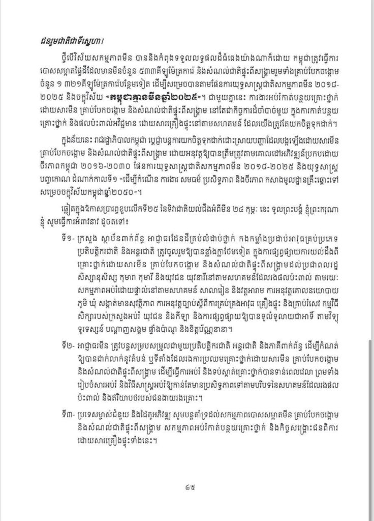 ទី៤- អាជ្ញាធរមីន ក្រសួង ស្ថាប័នពាក់ព័ន្ធ ប្រទេសម្ចាស់ជំនួយ និងដៃគូអភិវឌ្ឍគួរបន្តកៀរគរធនធាន ប្រកបដោយនវានុវត្តន៍ ជាពិសេសជំរុញការចូលរួមពីវិស័យឯកជន និងសប្បុរសជន ក្នុងដំណើរ ឆ្ពោះទៅរកការសម្រេចបានចក្ខុវិស័យ កម្ពុជាគ្មានមីនឆ្នាំ២០២៥។