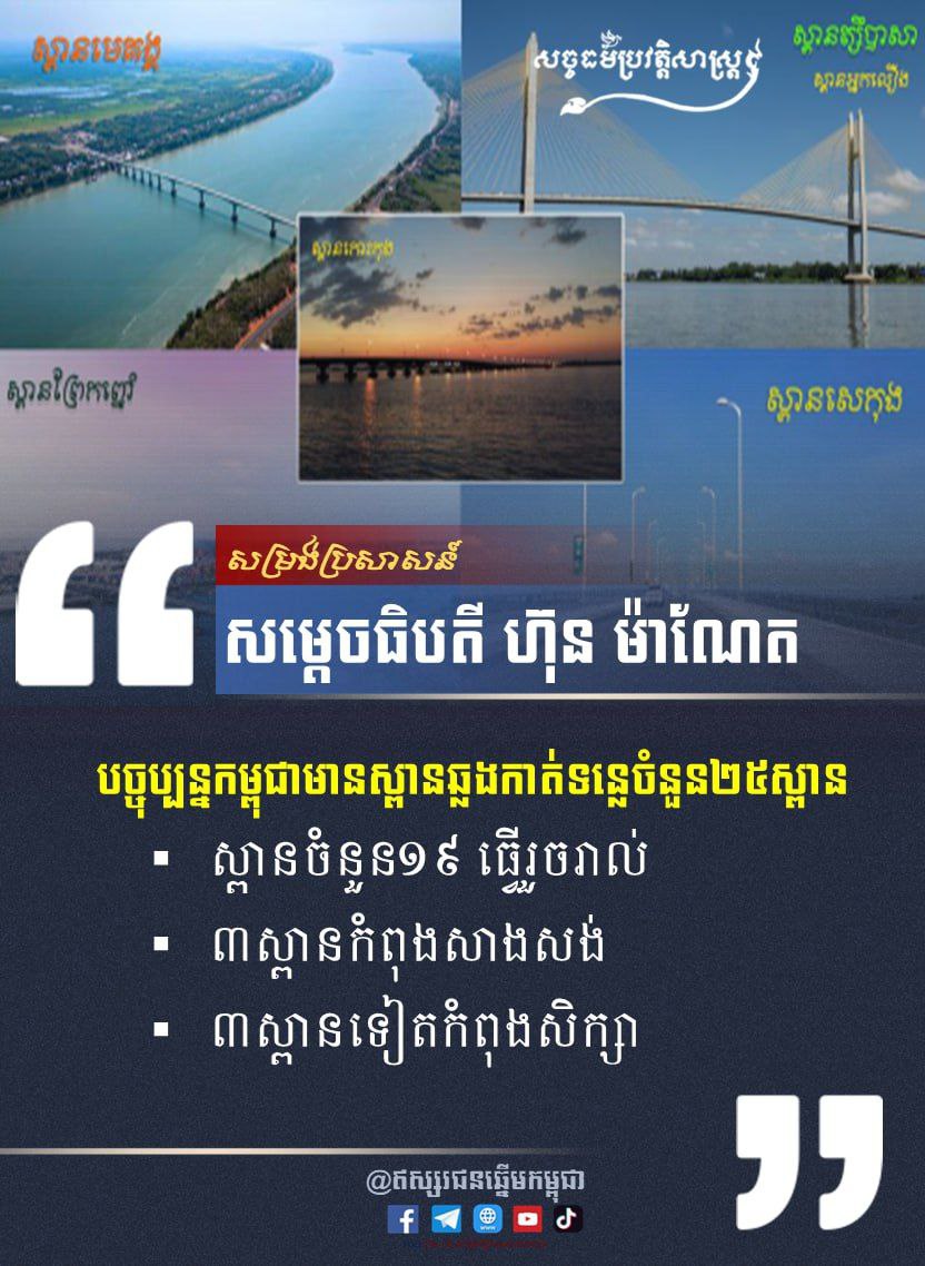 សម្ដេចធិបតី ហ៊ុន ម៉ាណែត បច្ចុប្បន្នកម្ពុជាមានស្ពានឆ្លងកាត់ទន្លេចំនួន ២៥ ស្ពាន