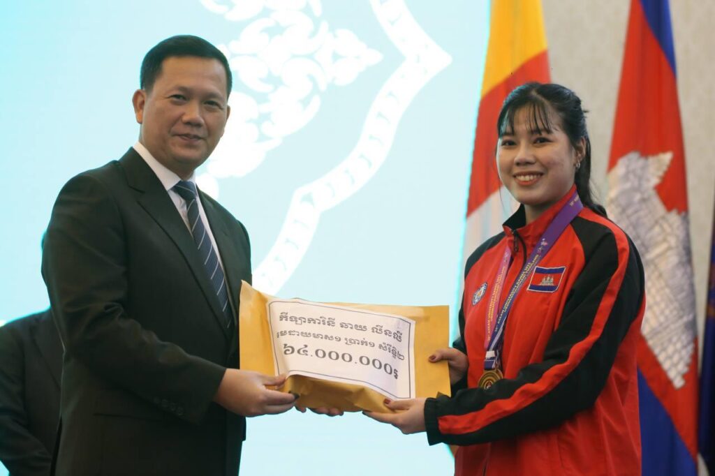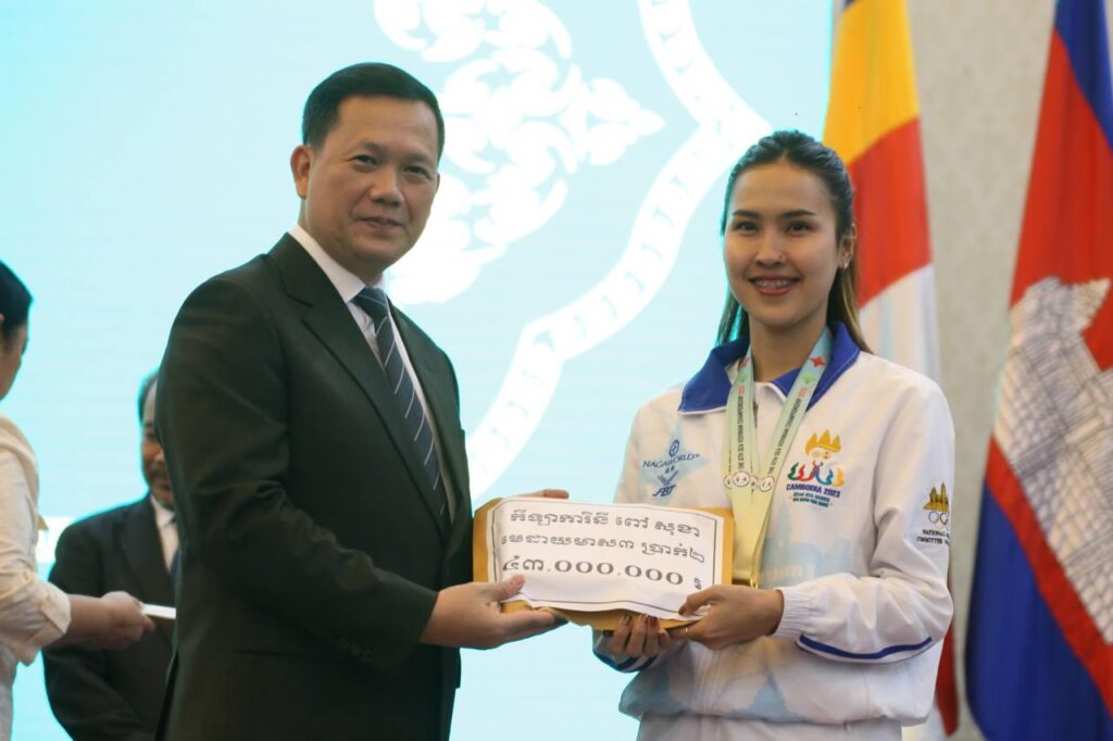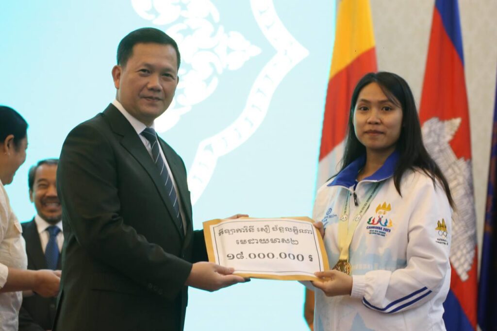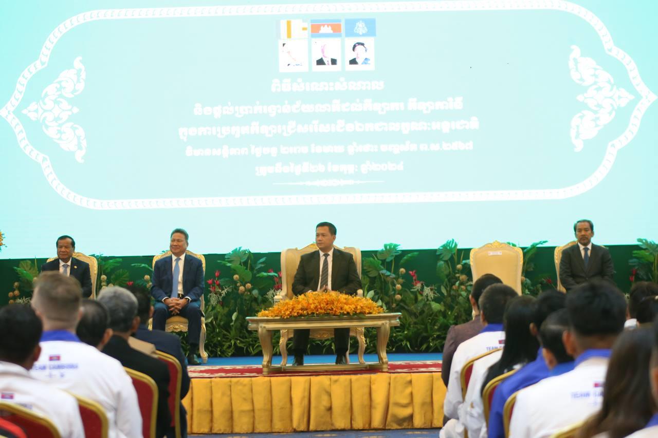 ភ្នំពេញ៖ សម្តេចមហាបវរធិបតី ហ៊ុន ម៉ាណែត នាយករដ្ឋមន្ត្រីនៃ ព្រះរាជាណាចក្រកម្ពុជា នៅរសៀលថ្ងៃចន្ទ ទី២៦ កុម្ភៈ ឆ្នាំ២០២៤ បានអញ្ជើញប្រគល់ប្រាក់រង្វាន់លើកទឹកចិត្ត របស់រាជរដ្ឋាភិបាល ជូនដល់ជ័យលាភី មេដាយមាស មេដាយប្រាក់ និងមេដាយសំរឹទ្ធ គ្រូបង្វឹក និងគ្រូជំនួយ ពីការប្រកួតកីឡាជ្រើសរើសជើងឯកពិភពលោក, ជើងឯកអាស៊ីអាគ្នេយ៍, ជើងឯកអាស៊ី និងការប្រកួត ជ្រើស រើស ជើងឯកសាកលវិទ្យាល័យអាស៊ាន នៅវិមានសន្តិភាព ។
