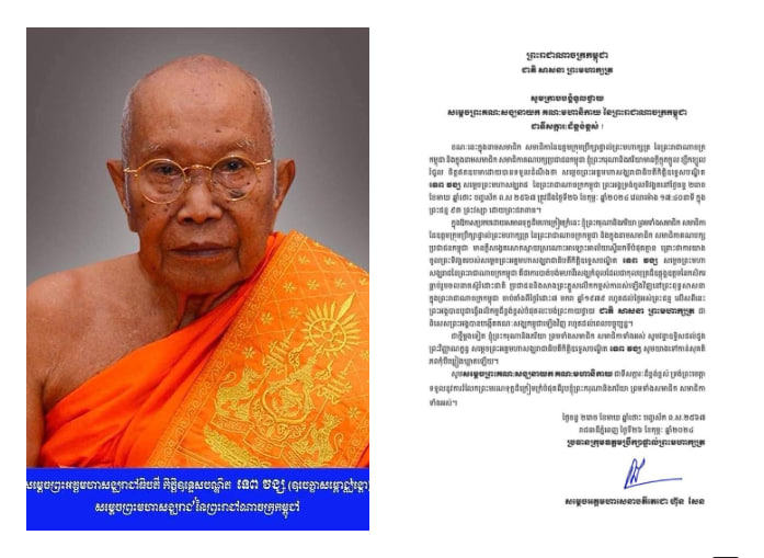 សម្តេចអគ្គមហាសេនាបតីតេជោ ហ៊ុន សែន ប្រធានក្រុមឧត្តមប្រឹក្សាផ្ទាល់ព្រះមហាក្សត្រ ផ្ញើសាររំលែកទុក្ខថ្វាយសម្តេចព្រះគណសង្ឃនាយក គណៈមហានិកាយ នៃព្រះរាជាណាចក្រកម្ពុជា ចំពោះការយាងចូលព្រះទិវង្គតរបស់ សម្ដេចព្រះអគ្គមហាសង្ឃរាជាធិបតី ទេព វង្ស