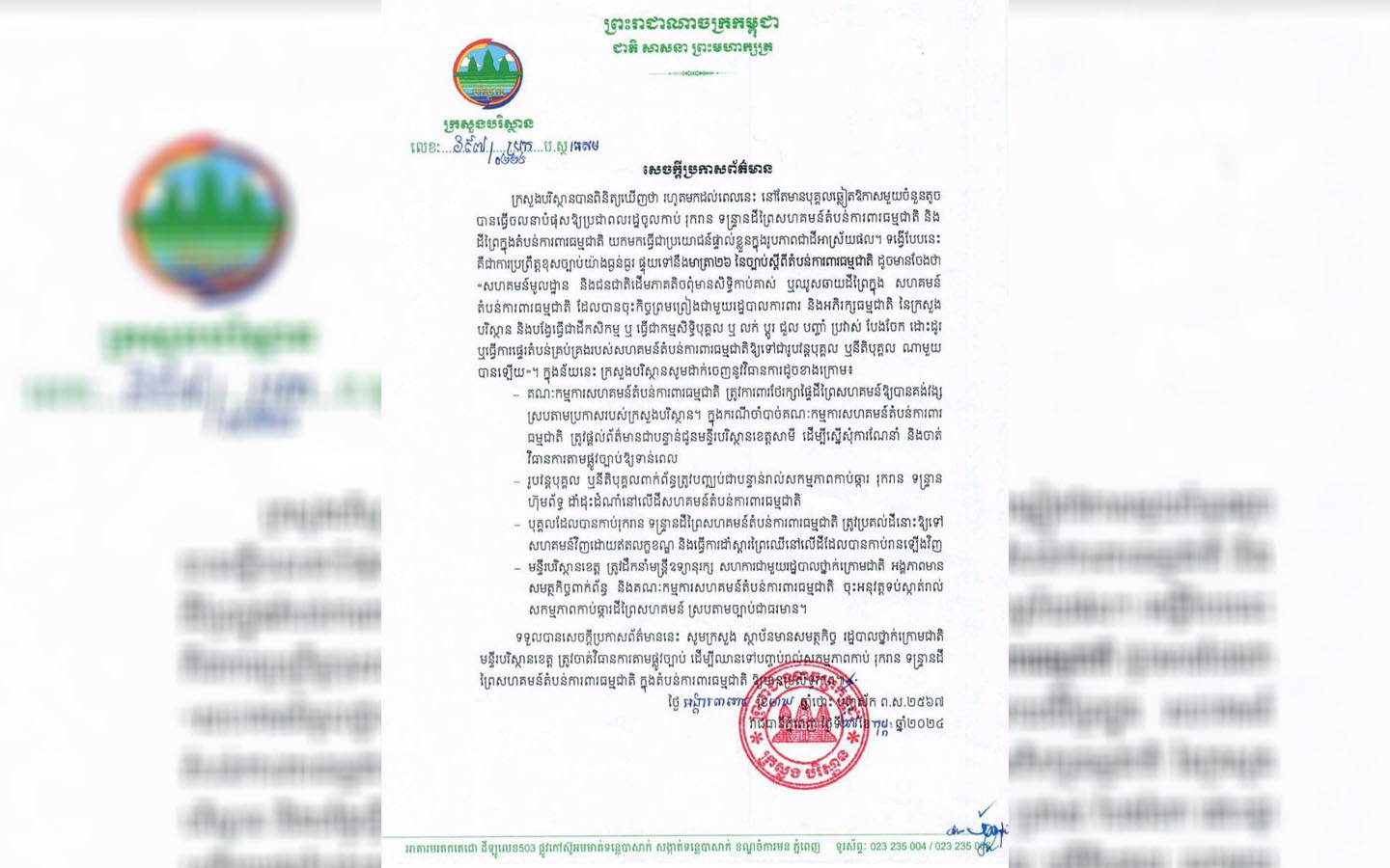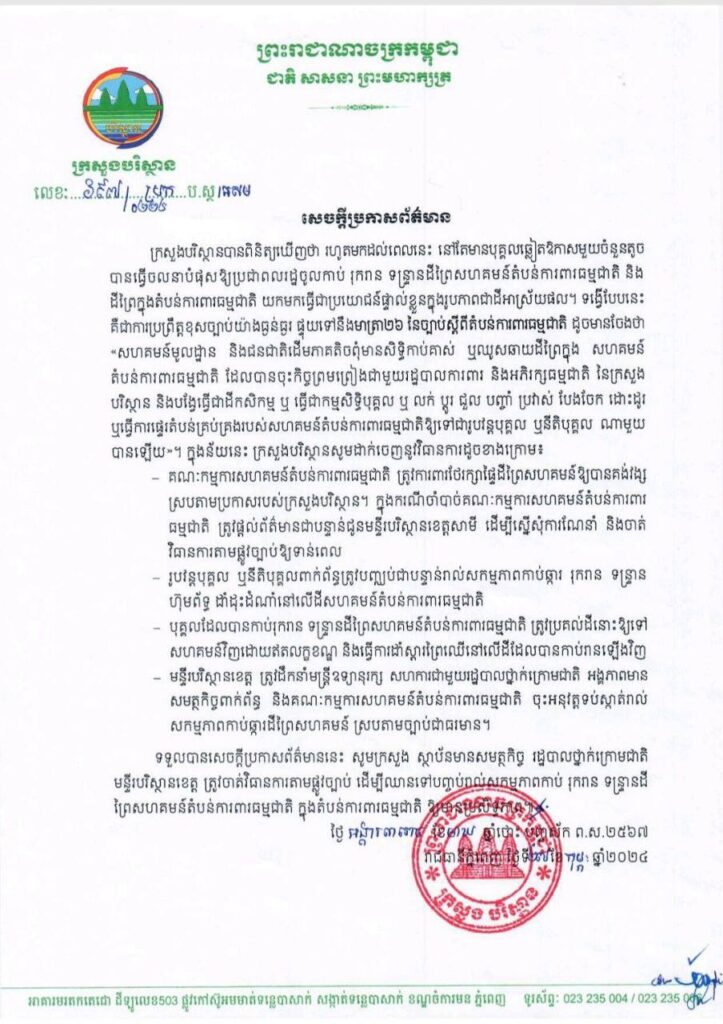 (ភ្នំពេញ)៖ ក្រសួងបរិស្ថាននៅថ្ងៃទី ២៧ ខែកុម្ភៈ ឆ្នាំ ២០២៤នេះ បានចេញសេចក្តីប្រកាសព័ត៌មាន មួយដោយបានលើកឡើងថា៖ ក្រសួង បានពិនិត្យឃើញថា រហូតមកដល់ពេលនេះ នៅតែមានបុគ្គលឆ្លៀតឱកាសមួយចំនួនតូច បានធ្វើចលនាបំផុសឱ្យប្រជាពលរដ្ឋចូលកាប់ រុករាន ទន្ទ្រានដីព្រៃសហគមន៍តំបន់ការពារធម្មជាតិ និង ដីព្រៃក្នុងតំបន់ការពារធម្មជាតិ យកមកធ្វើជាប្រយោជន៍ផ្ទាល់ខ្លួនក្នុងរូបភាពជាដីអាស្រ័យផល។