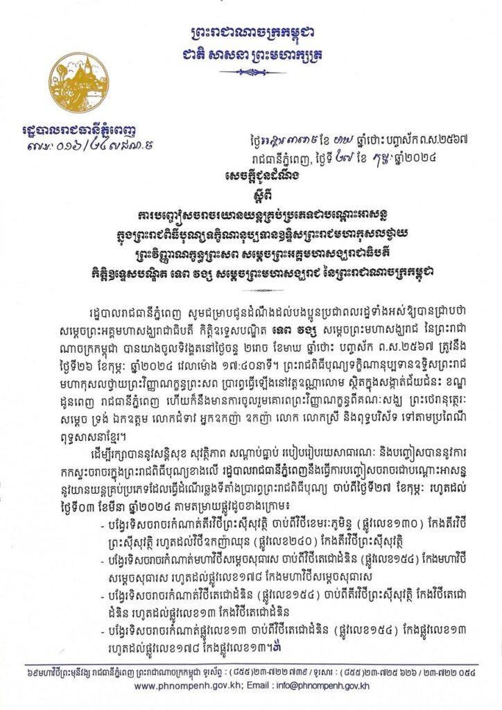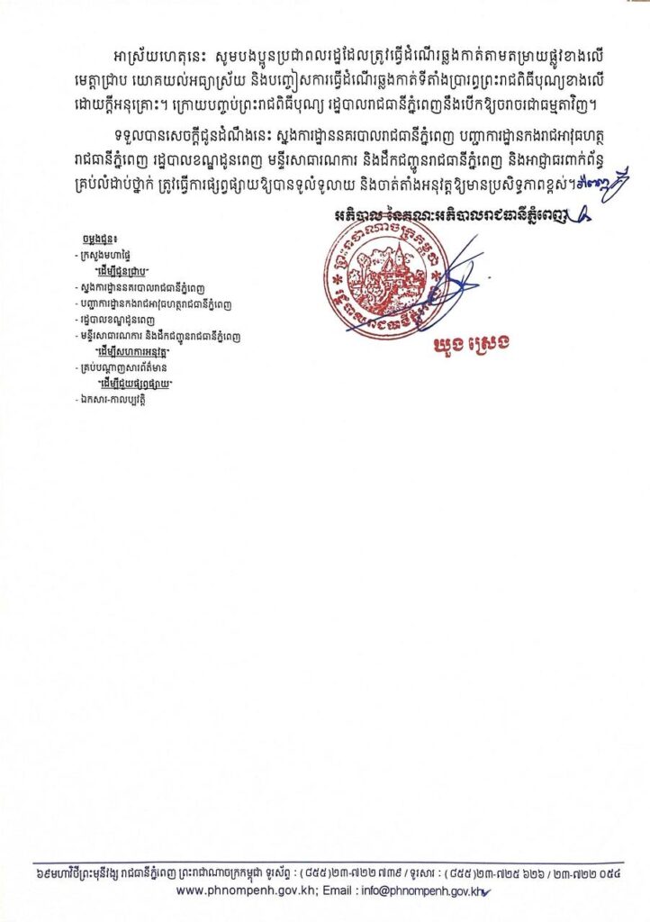 សូមបងប្អូនប្រជាពលរដ្ឋដែលត្រូវធ្វើដំណើរឆ្លងកាត់តាមតម្រាយផ្លូវខាងលើ មេត្តាជ្រាប យោគយល់អធ្យាស្រ័យ និងបញ្ចៀសការធ្វើដំណើរឆ្លងកាត់ទីតាំងប្រារព្ធព្រះរាជពិធីបុណ្យខាងលើ ដោយក្ដីអនុគ្រោះ។ ក្រោយបញ្ចប់ព្រះរាជពិធីបុណ្យ រដ្ឋបាលរាជធានីភ្នំពេញនឹងបើកឱ្យចរាចរជាធម្មតាវិញ ។