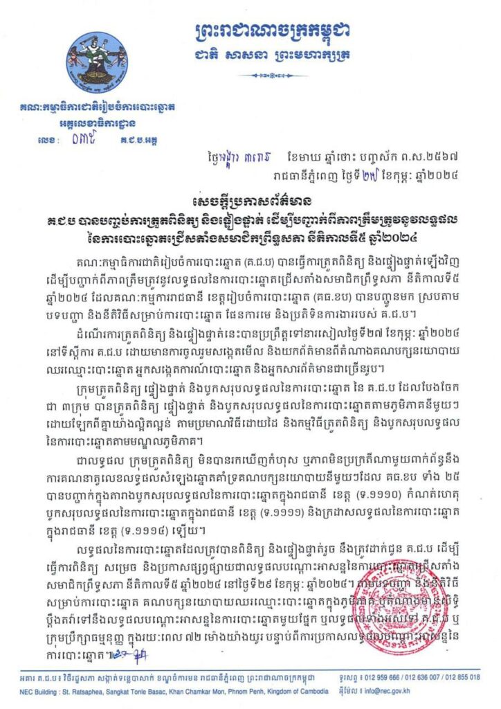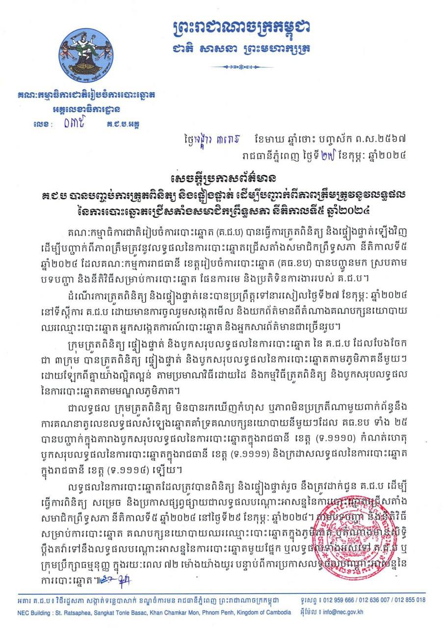 គ.ជ.ប បានបញ្ចប់ការត្រួតពិនិត្យ និងផ្ទៀងផ្ទាត់ ដើម្បីបញ្ជាក់ពីភាពត្រឹមត្រូវនូវលទ្ធផលនៃការបោះឆ្នោតជ្រើសតាំងសមាជិកព្រឹទ្ធសភា នីតិកាលទី៥ ឆ្នាំ២០២៤