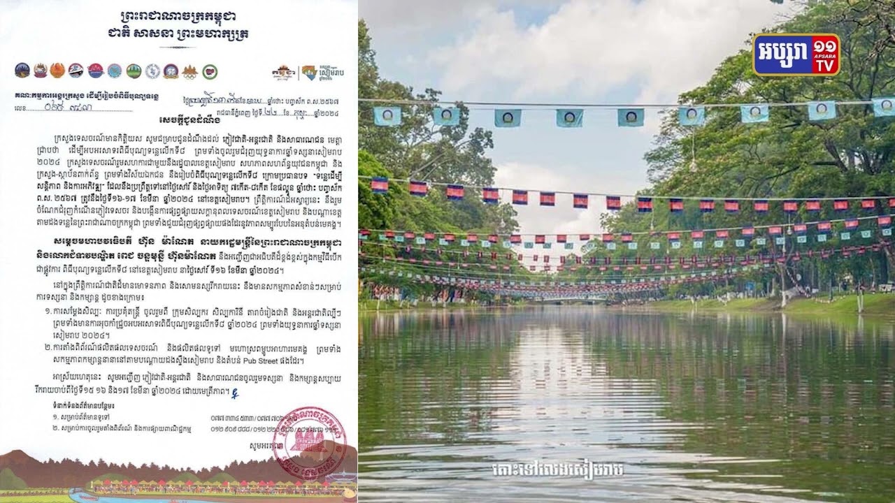 បុណ្យទន្លេជាលើកដំបូងក្នុងខេត្តសៀមរាប ដែលជិតមកដល់ក្នុងពេលខាងមុខនេះ នឹងអញ្ជើញចូលរួមអធិបតីដ៏ខ្ពង់ខ្ពស់ពីសម្តេចធិបតីនាយករដ្ឋមន្ត្រី និងលោកជំទាវ។ បុណ្យទន្លេលើកទី៨ ដែលត្រៀមនឹងរៀបចំធ្វើនៅតាមដងស្ទឹងសៀមរាប នឹងប្រារព្ធធ្វើឡើងរវាងពីថ្ងៃទី១៦ ដល់១៧ មីនា ឆ្នាំ២០២៤។