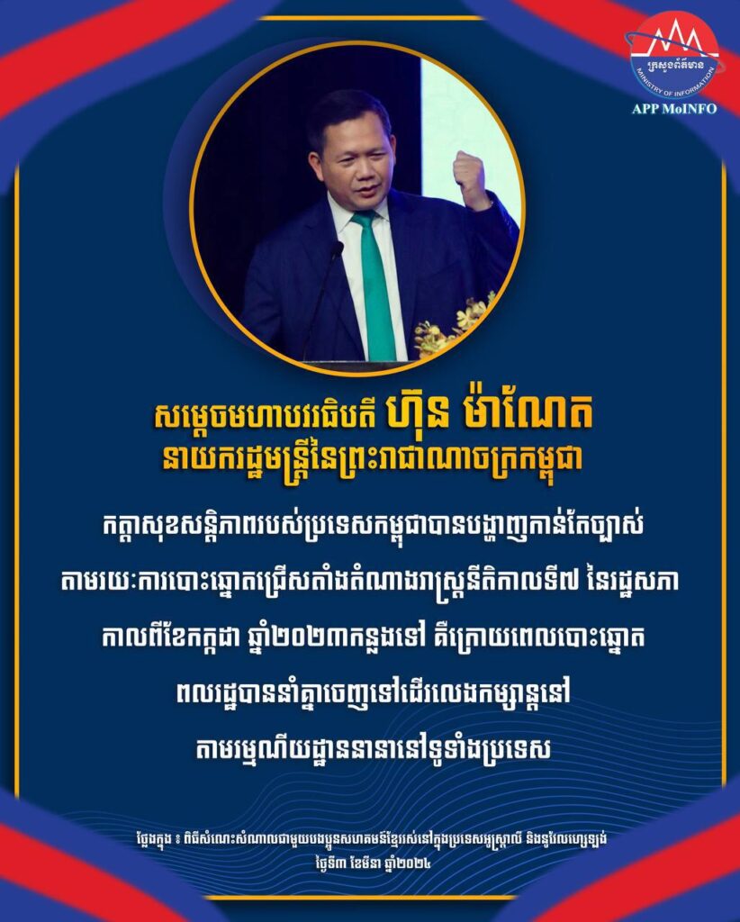 សម្ដេចធិបតី៖ “កត្តាសុខសន្ដិភាពរបស់កម្ពុជាបានបង្ហាញកាន់តែច្បាស់តាមរយៈការបោះឆ្នោតជ្រើសតាំងតំណាងរាស្ត្រនីតិកាលទី៧