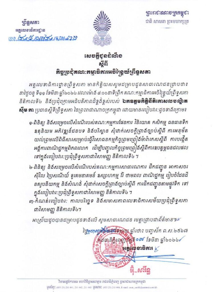 គណៈកម្មាធិការអចិន្ត្រៃយ៍ព្រឹទ្ធសភា នីតិកាលទី៤ នឹងប្រជុំក្រោមអធិបតីភាពដ៏ខ្ពង់ខ្ពស់របស់ឯកឧត្តមកិត្តិនីតិកោសលបណ្ឌិត ស៊ឹម កា ប្រធានស្តីទីព្រឹទ្ធសភា នៃព្រះរាជាណាចក្រកម្ពុជា នៅព្រឹកថ្ងៃទី១១ ខែមីនា ឆ្នាំ២០២៤។