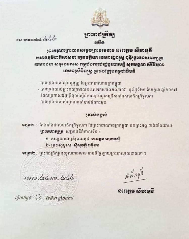 ភ្នំពេញ៖ ព្រះករុណា ព្រះបាទសម្តេចព្រះបរមនាថ នរោត្តម សីហមុនី ព្រះមហាក្សត្រ នៃព្រះរាជាណាចក្រកម្ពុជា បានចេញព្រះរាជក្រឹត្យត្រាស់បង្គាប់តែងតាំងសម្តេចព្រះរាជបុត្រី ព្រះអនុជ នរោត្តម អរុណរស្មី និងព្រះអង្គម្ចាស់ ស៊ីសុវត្ថិ ធម្មិកោ ជាសមាជិកព្រឹទ្ធសភា នីតិកាលទី៥។ នេះបើយោងតាមព្រះរាជក្រឹត្យចុះថ្ងៃទី៦ ខែមីនា ឆ្នាំ២០២៤។