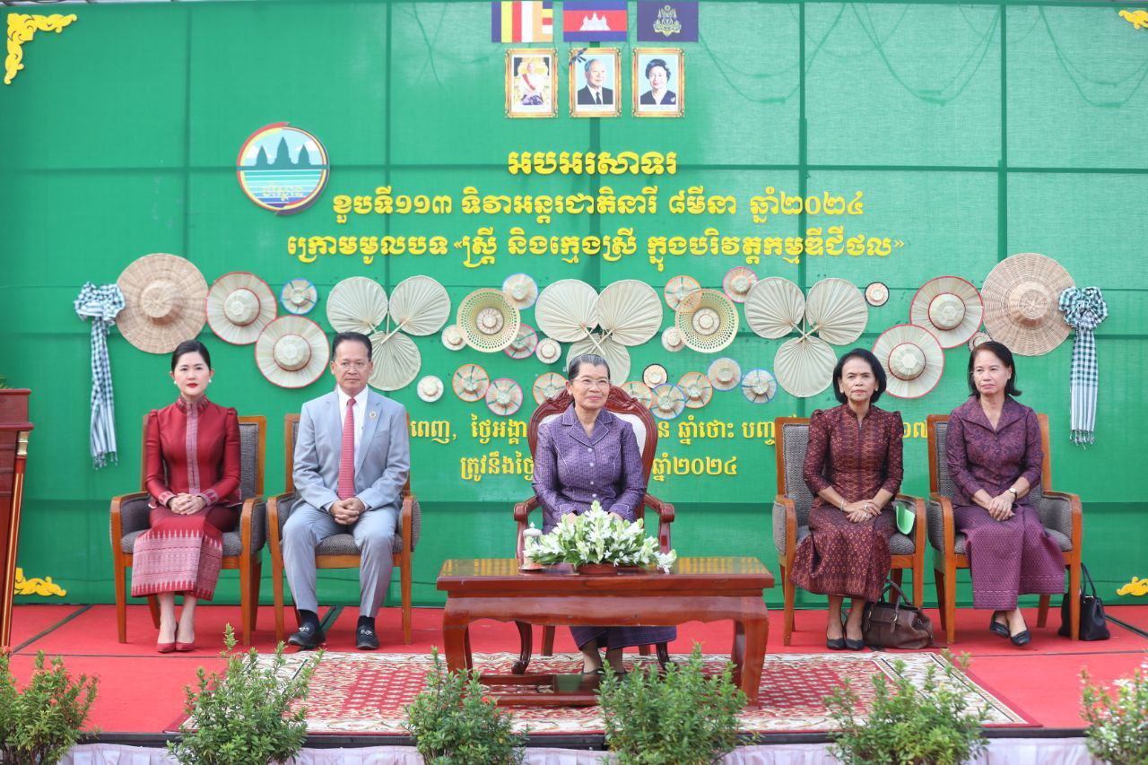 (ភ្នំពេញ)៖ សម្តេចកិត្តិសង្គហបណ្ឌិត ម៉ែន សំអន ឧត្តមប្រឹក្សាផ្ទាល់ព្រះមហាក្សត្រនៃព្រះរាជាណាចក្រកម្ពុជា បានអញ្ជើញអធិបតីក្នុងពិធីជួបសំណេះសំណាលជាមួយសាខាសមាគមនារីកម្ពុជាដើម្បីសន្តិភាព និងអភិវឌ្ឍន៍ក្រសួងបរិស្ថាន ដើម្បីអបអរសាទរ ខួបលើកទី១១៣ ទិវាអន្តរជាតិនារី ៨ មីនា ២០២៤ ក្រោមមូលបទ «ស្រ្តីនិងក្មេងស្រីក្នុងបរិវត្តកម្មឌីជីថល» ដែលបានរៀបចំឡើងនៅសណ្ឋាការកាំបូឌីយ៉ាណា រាជធានីភ្នំពេញ នារសៀលថ្ងៃទី១២ ខែមីនា ឆ្នាំ២០២៤ ។
