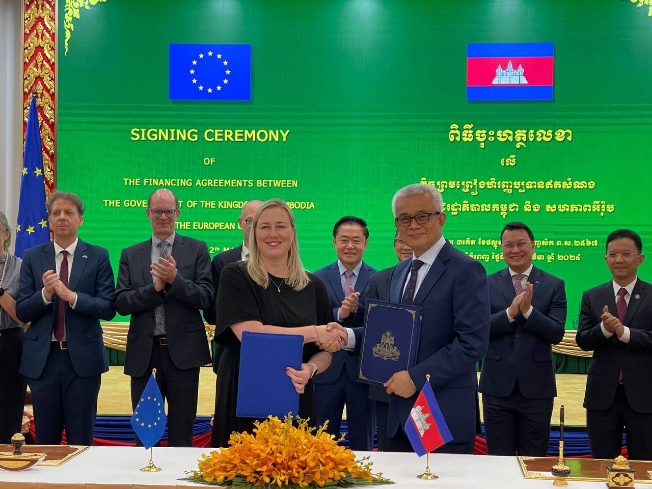 ពិធីចុះហត្ថលេខាបានធ្វើឡើងរវាងឯកឧត្តមអគ្គបណ្ឌិតសភាចារ្យ អូន ព័ន្ធមុនីរ័ត្ន ឧបនាយករដ្ឋមន្ត្រី រដ្ឋមន្ត្រីក្រសួងសេដ្ឋកិច្ច និងហិរញ្ញវត្ថុ ជាមួយស្នងការអឺរ៉ុប លោកស្រី ជូតា យូភីលឡៃណាន់(Jutta Urpilainen) តំណាងមកពីប្រទេសសមាជិកសហភាពអឺរ៉ុប កាលពីរសៀលថ្ងៃទី១២ ខែមីនា ឆ្នាំ ២០២៤នានៅក្រសួងសេដ្ឋកិច្ច និងហិរញ្ញវត្ថុ។