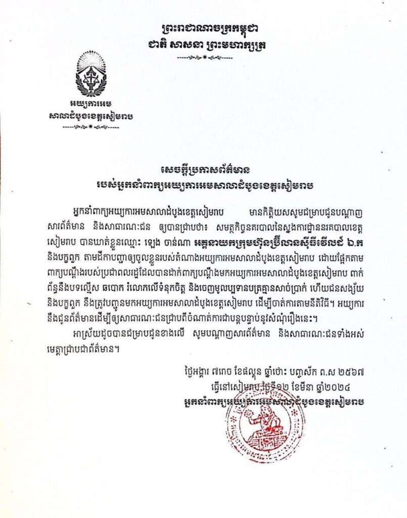 បុគ្គលឈ្មោះ ឡេង ចាន់ណា ដែលឆបោកលុយពលរដ្ឋរឿងដីធ្លីផ្ទះ និងការវិនិយោគរាប់លានដុល្លារ ត្រូវកម្លាំងនគរបាលខេត្តសៀមរាប ឃាត់ខ្លួនបានហើយ