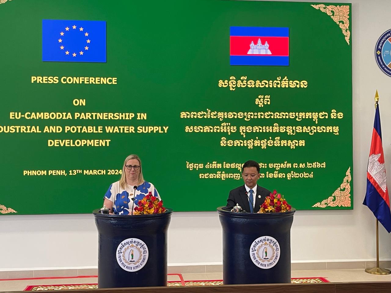 យើងសូមថ្លែងអំណរគុណដល់សហភាពអឺរ៉ុប និងដៃគូអភិវឌ្ឍន៍ពាក់ព័ន្ធចំពោះការបន្តគាំទ្រ ដ៏ខ្ជាប់ ខ្ជួន ក្នុងការអភិវឌ្ឍវិស័យទឹកស្អាតរបស់កម្ពុជា”។ ឯកឧត្តម បញ្ជាក់បន្ថែមថា ៖ រោង ចក្រ ផលិតទឹកស្អាតដំណាក់កាលទី១ និងដំណាក់កាលទី២ ដែលមានសមត្ថិភាពផលិតទឺក ស្អាត បាន ចំនួន ៣៩ម៉ឺនមែត្រគូបក្នុង ១ថ្ងៃ គឺជាសមិទ្ធផលលេចធ្លោមួយ ក្នុងការអភិវឌ្ឍហេដ្ឋារចនាសម្ព័ន្ធទឹកស្អាតនៅកម្ពុជា ដែលធានាបាននូវការផលិតទឹកស្អាតដល់ប្រជាពលរដ្ឋរាប់លាននាក់។ គម្រោងនេះក៏បានរួមចំណែកដល់ការតភ្ជាប់បណ្តាញទឹកស្អាតថ្មីដល់ប្រជាពលរដ្ឋប្រមាណ ១៧ម៉ឺនតំណ រួមទាំងប្រជាពលរដ្ឋក្រីក្រ និងរោងចក្រសហគ្រាសប្រមាណជា ២ម៉ឺន៥ពាន់តំណផងដែរ ។
