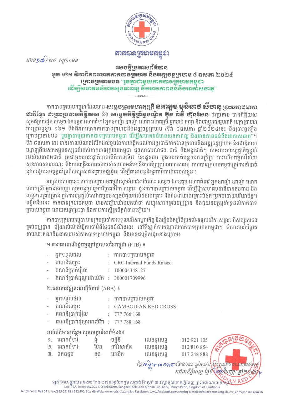 ទិវាពិភពលោកកាកបាទក្រហម និងអឌ្ឍចន្ទក្រហម ៨ ឧសភា ២០២៤ ។នេះបើយោងតាមសេចក្តីប្រកាសព័ត៌មានរបស់កាកបាទក្រហមកម្ពុជា។