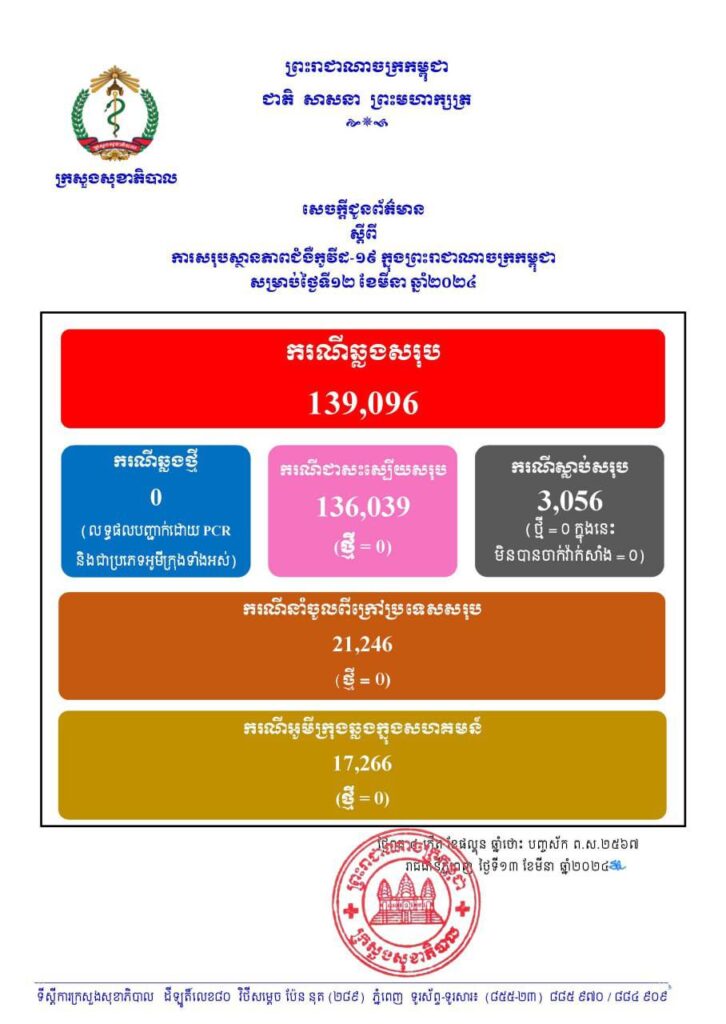 ២. កូវីដ គ្មានករណីថ្មី គ្មានអ្នកជាសះស្បើយ និងគ្មានអ្នកស្លាប់។