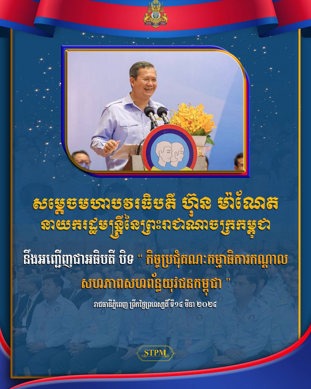 ភ្នំពេញ៖ សម្តេចមហាបវរធិបតី ហ៊ុន ម៉ាណែត នាយករដ្ឋមន្ត្រី នៃព្រះរាជាណាចក្រកម្ពុជា អញ្ជើញជាអធិបតី បិទកិច្ចប្រជុំ គណៈកម្មាធិការកណ្ដាលសហភាពសហព័ន្ធយុវជនកម្ពុជា (ស.ស.យ.ក.) នៅព្រឹកថ្ងៃព្រហស្បតិ៍ទី១៤ ខែមីនា ឆ្នាំ ២០២៤ នៅសាល សន្និសីទសណ្ឋាគារសុខាភ្នំពេញ ។