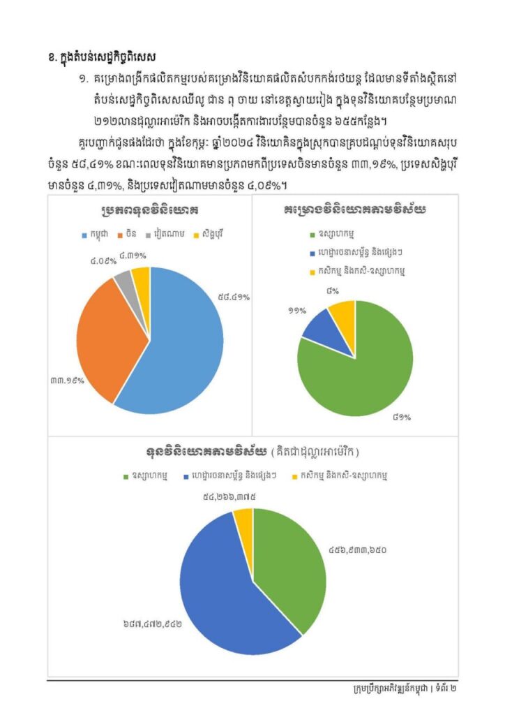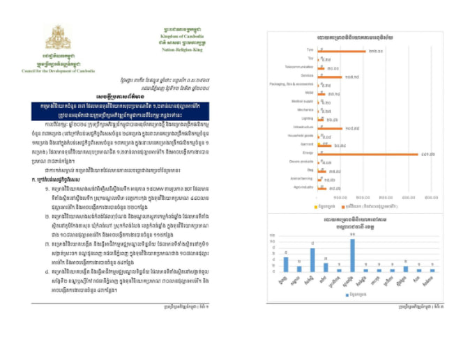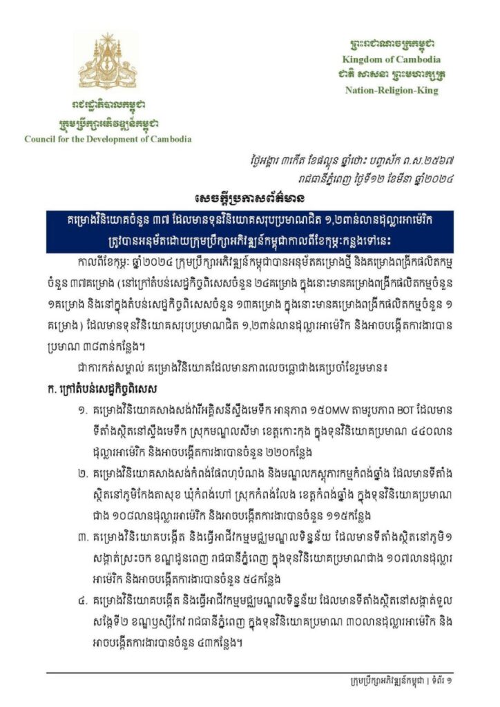 ក្រៅពីគម្រោងកំពង់ផែពហុបំណងនៅកំពង់ឆ្នាំង ខេត្តកោះកុងក៏នឹងមានវារីអគ្គិសនីថ្មីមួយបន្ថែមទៀតដែលមានទុនវិនិយោគ៤៤០លានដុល្លារ។គម្រោងនេះស្ថិតនៅស្ទឹងមេទឹក ស្រុកមណ្ឌលសីមា។ តំបន់សេដ្ឋកិច្ចពិសេសឈីលូ ជាន ពុ ចាយ នៅខេត្តស្វាយរៀងឯណោះវិញ ទាក់យកបានគម្រោងវិនិយោគផលិតសំបកកង់រថយន្តតម្លៃ២១២លានដុល្លារដែលអាចបង្កើតការងារបានជាង១០០០កន្លែង។ក្រៅពីនេះ មជ្ឈមណ្ឌលទិន្នន័យ២កន្លែងនឹងត្រូវបង្កើតឡើងសម្រាប់ការធ្វើអាជីវកម្មដែលមានទុនសរុបប្រមាណ ១៣៧លានដុល្លារ។ មណ្ឌលទិន្ន័យទាំង២មានទីតាំងនៅរាជធានីភ្នំពេញ។