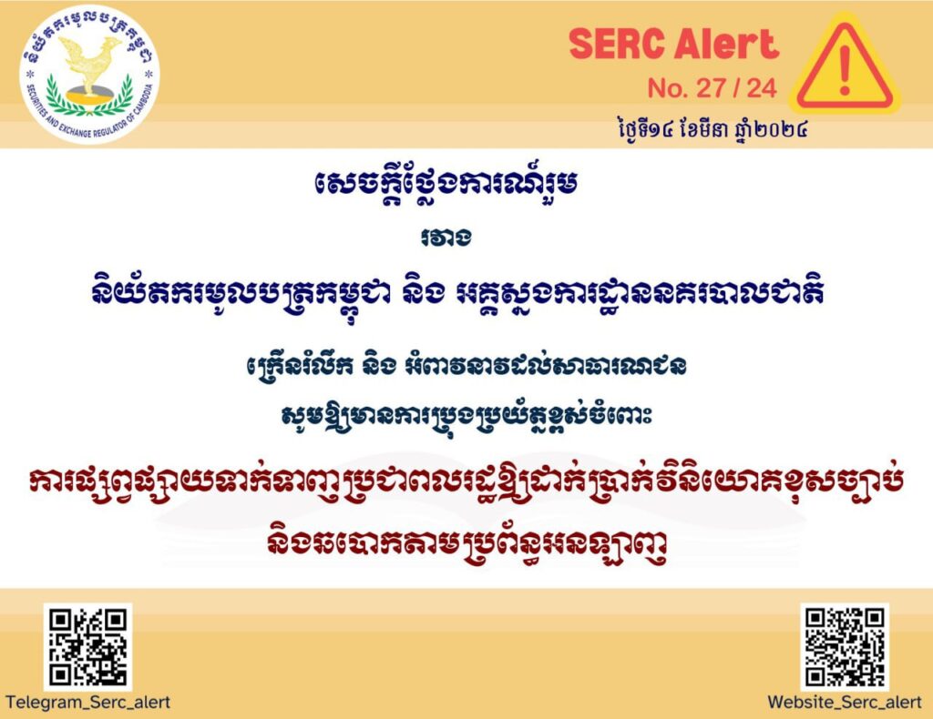 និយ័តករមូលបត្រកម្ពុជានិងអគ្គស្នងការដ្ឋាននគរបាលជាតិនៅថ្ងៃនេះបានរួមគ្នាចេញសេចក្តីថ្លែងការណ៍ព្រមានពីអំពើឆបោកតាមអនឡាញនេះដែលកំពុងតែរីករាលដាលគួរឲ្យបារម្ភ។ ស្ថាប័នទាំងពីរ លើកឡើងថា ការដាក់ប្រាក់ក្នុងគម្រោងវិនិយោគខុសច្បាប់ទាំងនេះបានបណ្តាលឲ្យប្រជាពលរដ្ឋខាតបង់ថវិកា និងទ្រព្យសម្បត្តិជាច្រើន។