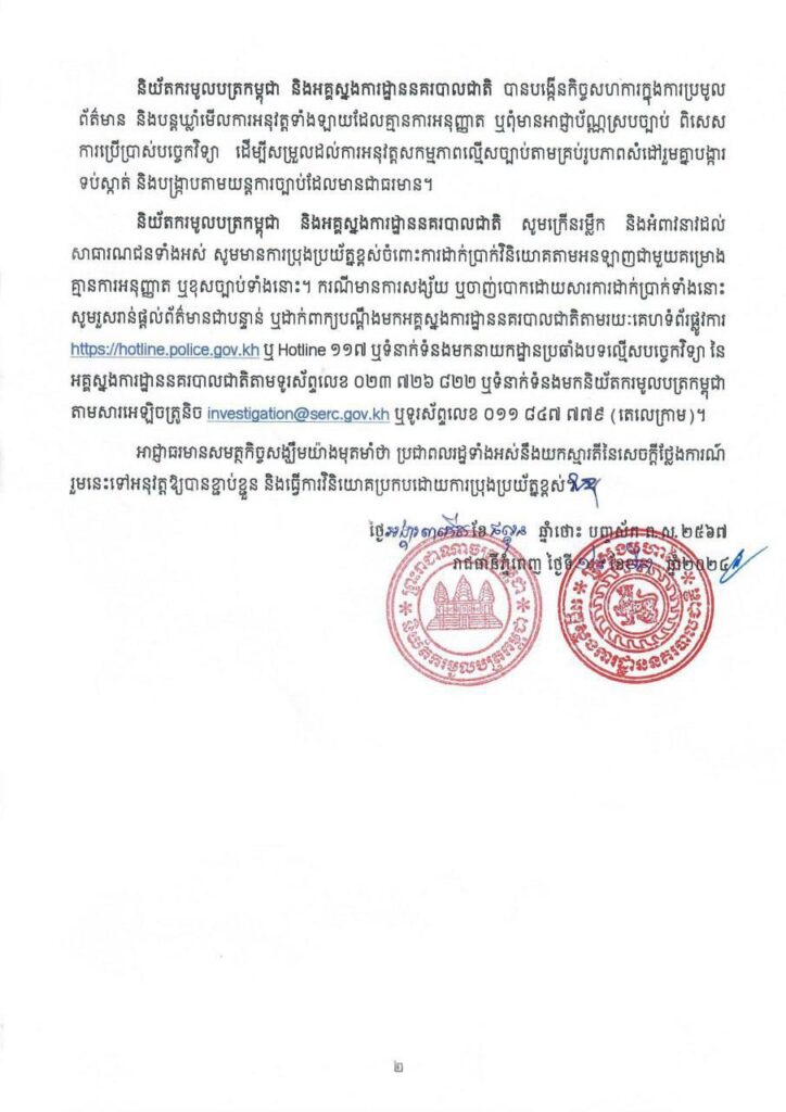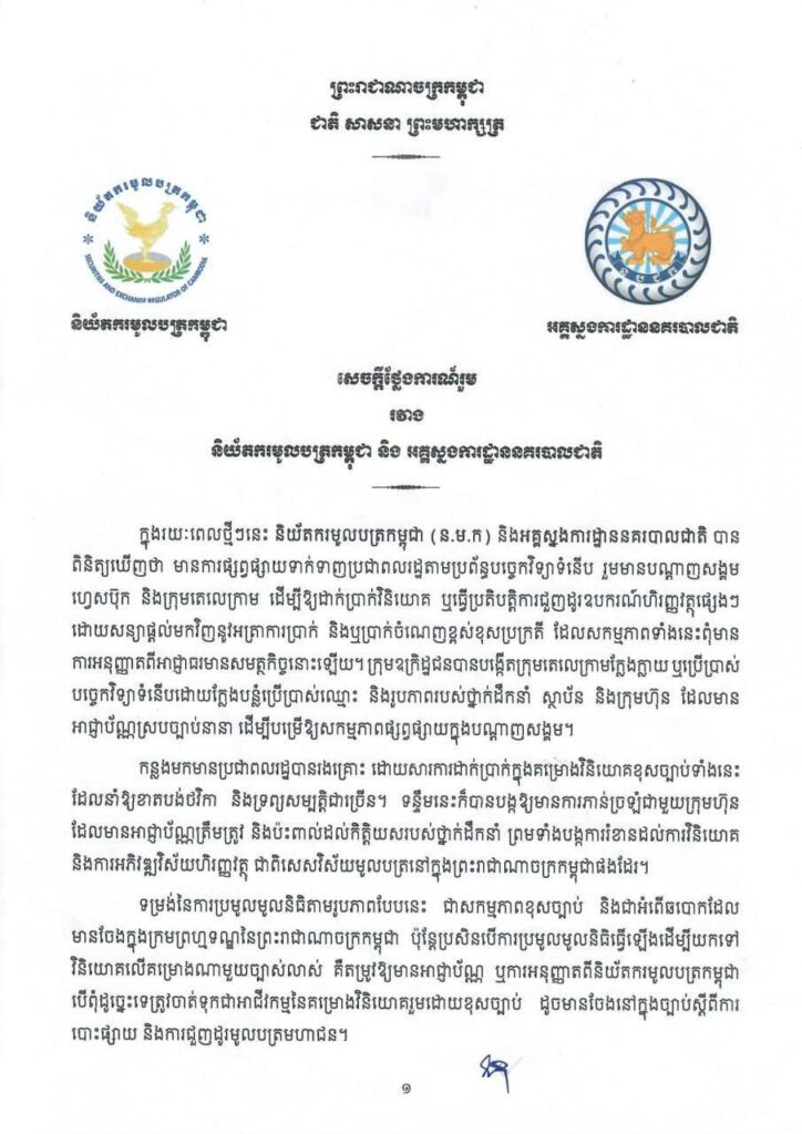 និយ័តករមូលបត្រកម្ពុជា និងអគ្គស្នងការដ្ឋាននគរបាលជាតិ កំពុងប្រមូលព័ត៌មាន និងឃ្លាំមើលការប្រើប្រាស់បច្ចេកវិទ្យាដើម្បីប្រព្រឹត្តិបទល្មើសតាមគ្រប់រូបភាព។ ស្ថាប័នទាំងពីរក្រើនរំលឹកឲ្យប្រជាជនប្រុងប្រយ័ត្ន៕ អត្ថបទ៖ ទួន សុផល