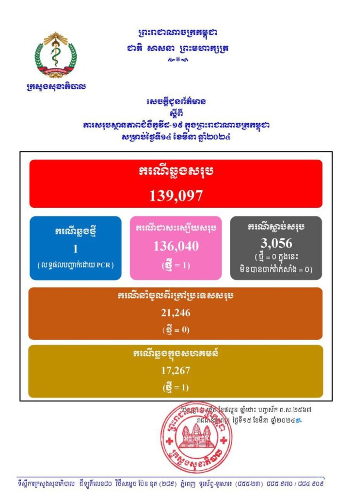 ៤. កូវីដ ករណីថ្មី ១នាក់ អ្នកជាសះស្បើយ ១នាក់ និងគ្មានអ្នកស្លាប់។